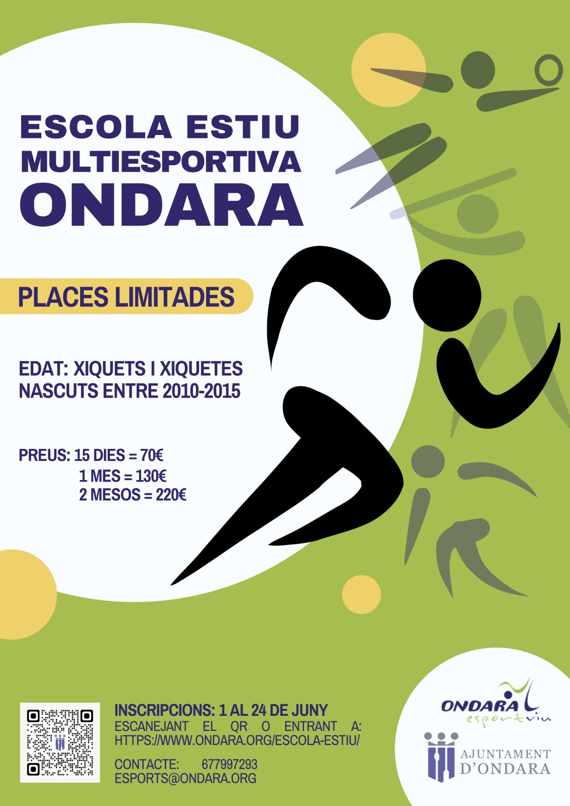 La Escuela Multiesportiva se celebrará a las instalaciones de la Piscina y el Pabellón Municipal de Ondara y permitirá a los niños y niñas de 7 a 12 años realizar actividades lúdico-deportivas durante las vacaciones de verano. Va dirigida a los nacidos a partir del año 2010 hasta el 2015 (las plazas son limitadas a un máximo de 120 alumnos). El precio es de 75 euros la quincena, 130 euros si se trata del mes completo y 220 euros dos meses.