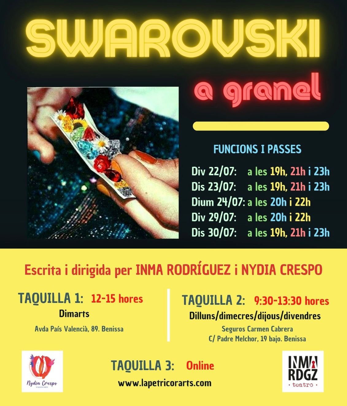 Swarovski a Granel, es el título de la propuesta teatral que se estrena hoy, viernes 22 de julio, en Benissa, pero que podrá disfrutarse, en los diferentes pases programados, hasta el 30 de julio en la localidad. De la mano de Inma Rodríguez y Nydia Crespo, autoras y directoras de la obra, unos 35 actores y actrices interpretarán a través de un total de 11 escenas, entrelazadas, historias, realidades y existencias, que muestran el alma de las personas. Una propuesta teatral que pretende hacer un recorrido por las opresiones que sufrimos día a día, según indican las promotoras de este proyecto teatral.