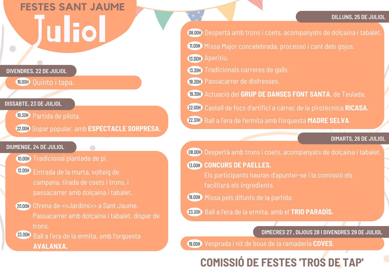 20:00h Ofrenda de ‘Jardins’ a San Jaime. Pasacalles con dolçaina y tabalet, disparo de cohetes.