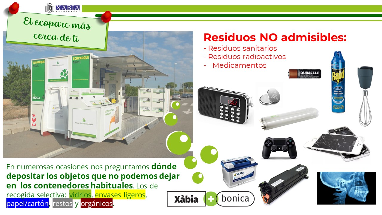 El departamento de Servicios del Ayuntamiento de Xàbia, en colaboración con la empresa encargada de la recogida y limpieza viaria TETMA, pone en marcha el ecoparque móvil a partir de la próxima semana con intención de facilitar el reciclaje de material electrónico a los vecinos de los núcleos urbanos y al mismo tiempo concienciar sobre la necesidad de ir al ecoparque fijo (Travesía Les Sorts) para depositar los enseres y otros residuos.