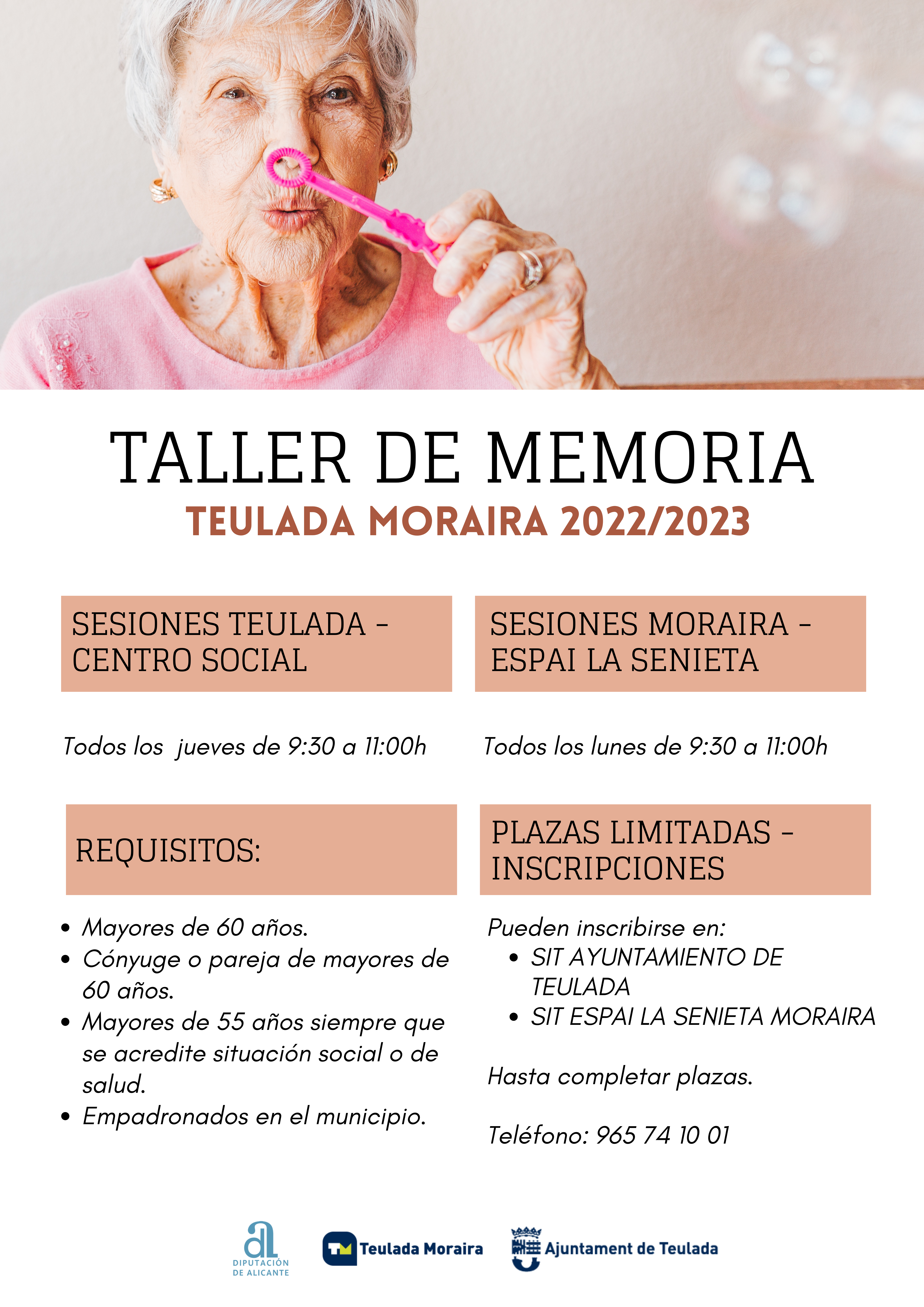 Desde el departamento de Servicios Sociales del Ayuntamiento de Teulada, queda abierto el plazo de inscripción, hasta completar plazas, para el Taller de Memoria 2022/2023.