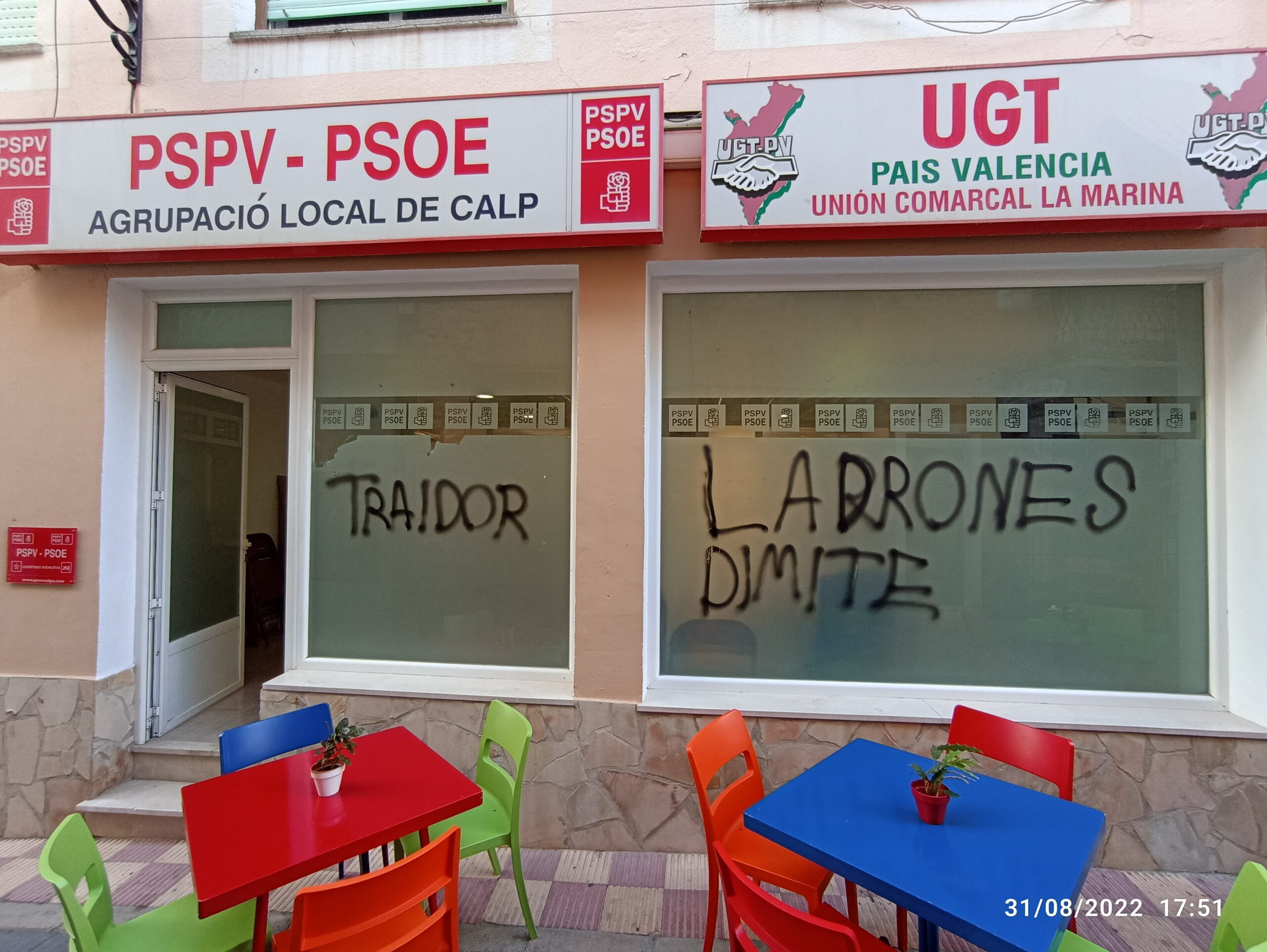 Las dependencias socialistas, ubicadas en la céntrica calle Mayor de Calp, han sido objeto de actos vandálicos según denuncian desde la propia agrupación local socialitas. Ocurrió la noche del 30 al 31 de agosto. La tarde de ayer, cuando militantes socialistas acudieron a la sede para celebrar una reunión, se encontraron con la desagradable sorpresa. En la fachada de la sede aparecieron las palabras «traidor», «ladrón» y «dimite», garabateadas con una especie de spray negro sobre las vidrieras frontales del local.
