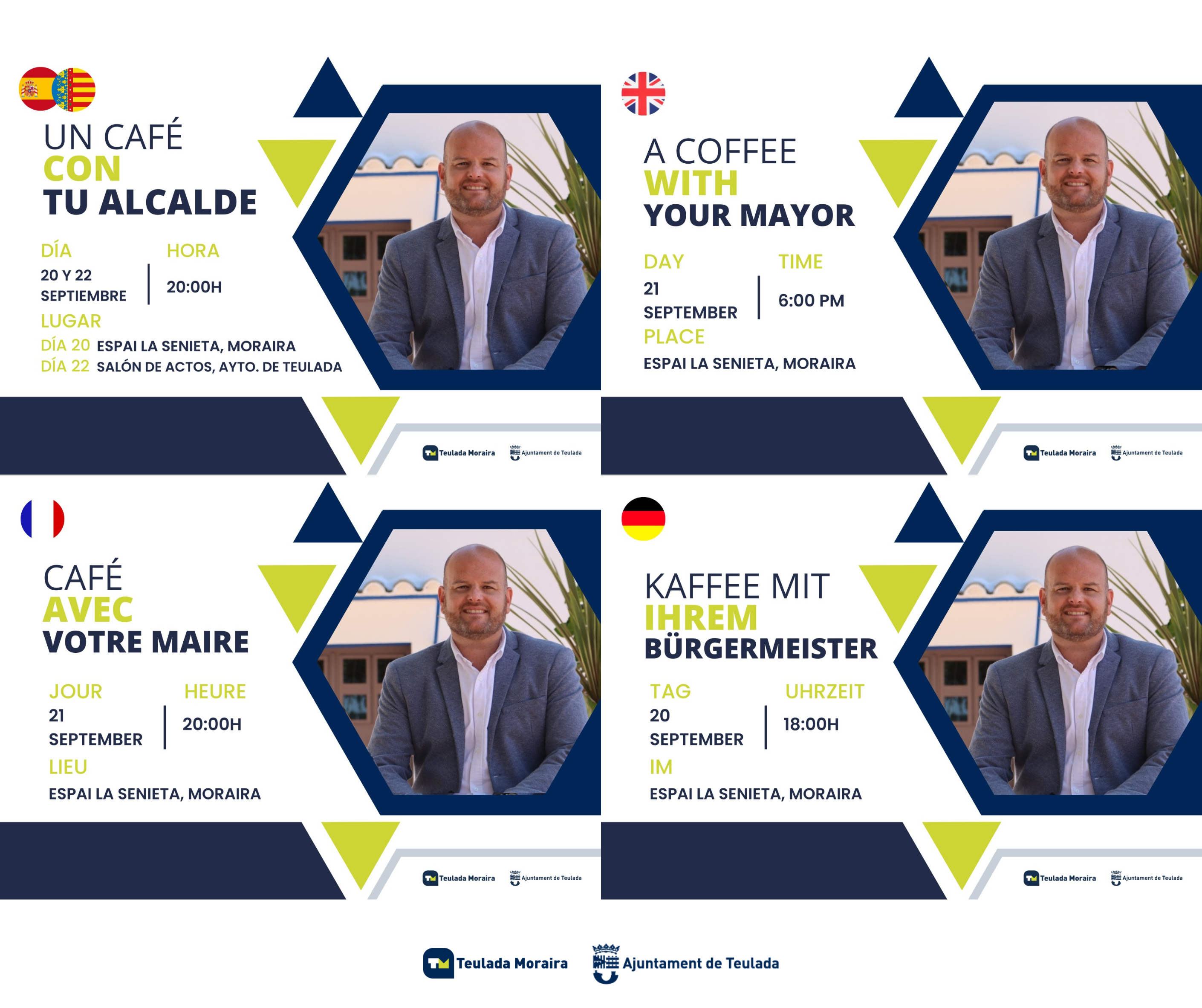 Tras la exitosa primera edición de Un café con tu alcalde, el alcalde de Teulada Moraira, Raúl Llobell, volverá a dedicar un espacio de diálogo como política de proximidad al ciudadano. Las sesiones se basarán en el diálogo constructivo sobre iniciativas y mejoras en el municipio con todos y para todos, estableciendo diferentes sesiones en castellano y valenciano, inglés, alemán y francés.