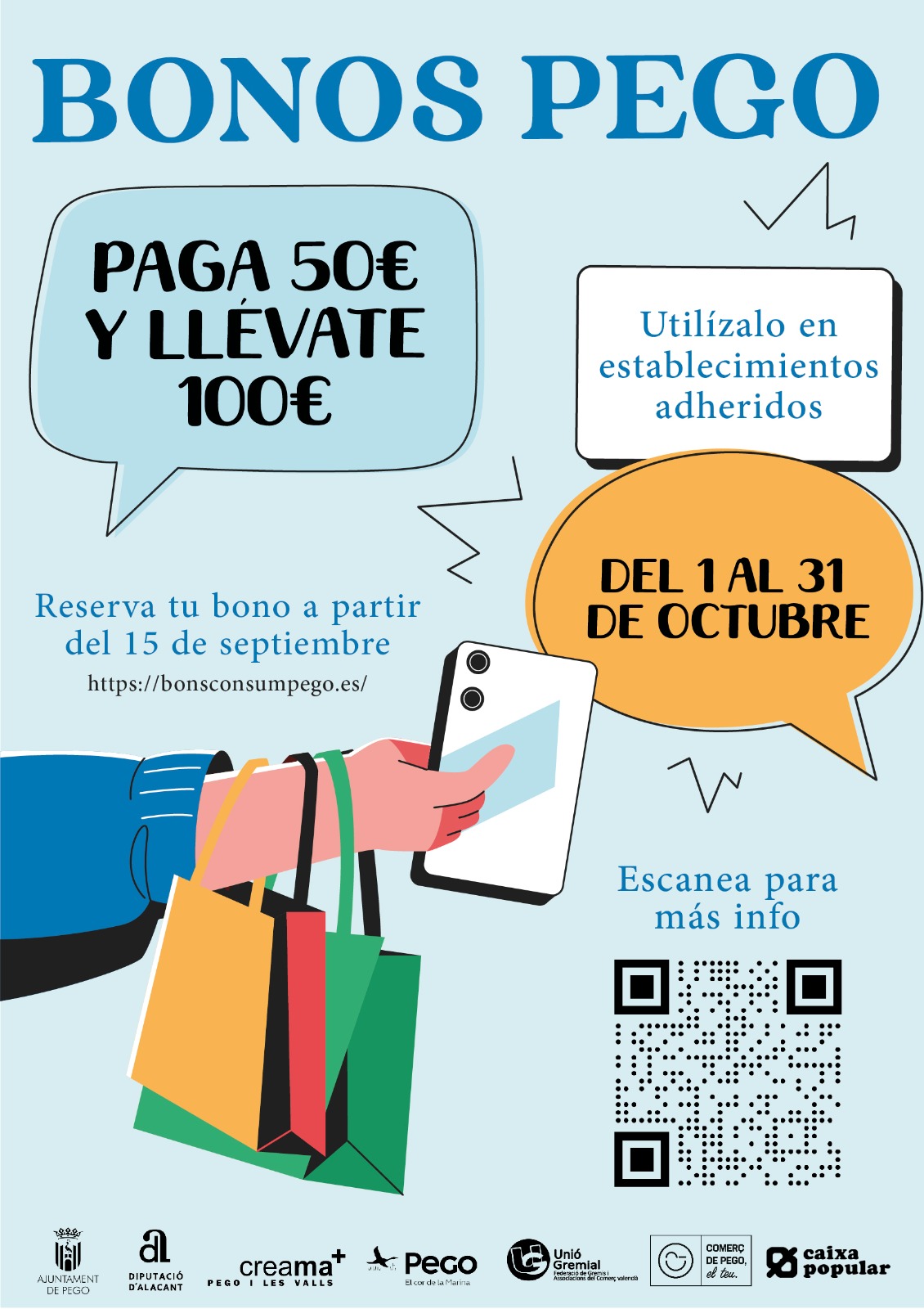 A partir de hoy, 15 de septiembre, se puede solicitar cita para recoger las tarjetas de la campaña de promoción de los Bonos Consumo Pego. La cita se ha de reservar a través de la web y el 19 de septiembre se iniciará la entrega de las tarjetas monedero. Finalmente, del 1 al 31 de octubre es la fecha fijada para gastar los bonos en los comercios adheridos a esta campaña de promoción del consumo en el comercio local.