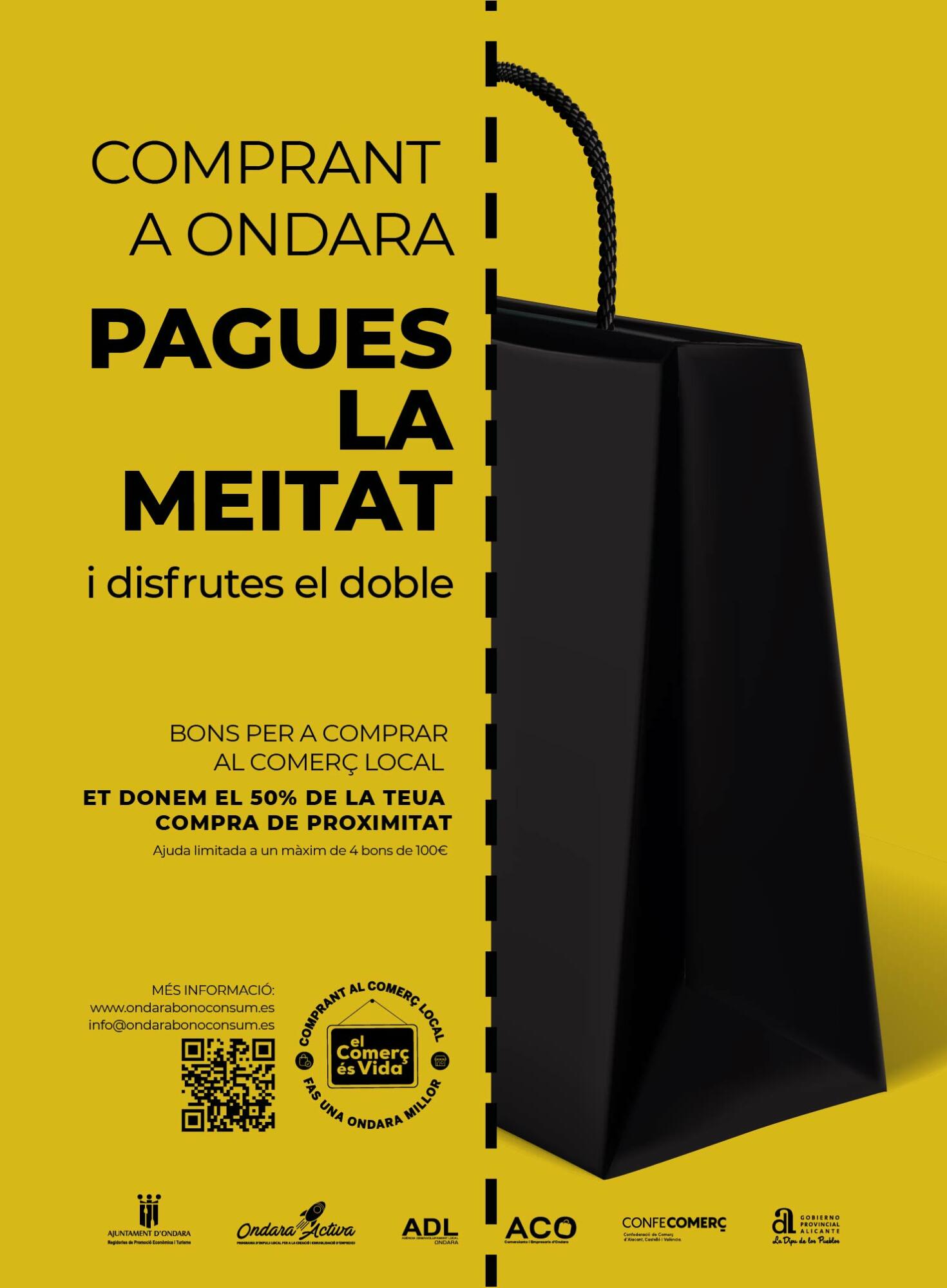 Los Bonos Consumo Ondara estarán emitidos por Confecomerç CV. Los ciudadanos abonan el 50% del coste de la tarjeta y la fecha máxima de consumo de los bonos será el 31 de octubre de 2022. Los bonos pueden llegar un valor de 100 €, de los cuales el ciudadano aporta 50 €, recibiendo 4 bonos de 25€ para poderlos cambiar en 4 compras. Esta distribución representa para la ciudadanía un descuento del 50%.