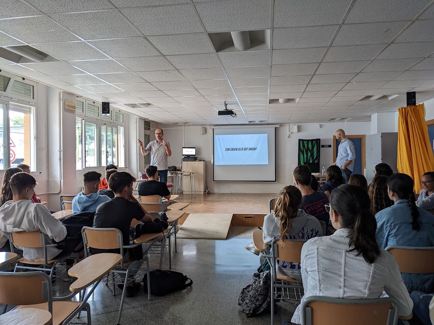 Los alumnos y alumnas de segundo de bachillerato han salido de sus aulas para participar en una conferencia sobre pensamiento crítico titulada ¿Por qué pensamos lo que pensamos?, que ha sido conducida por Vicent Botella i Soler, físico, científico de datos y escritor; y por Javier López Alós, doctor en filosofía y escritor.