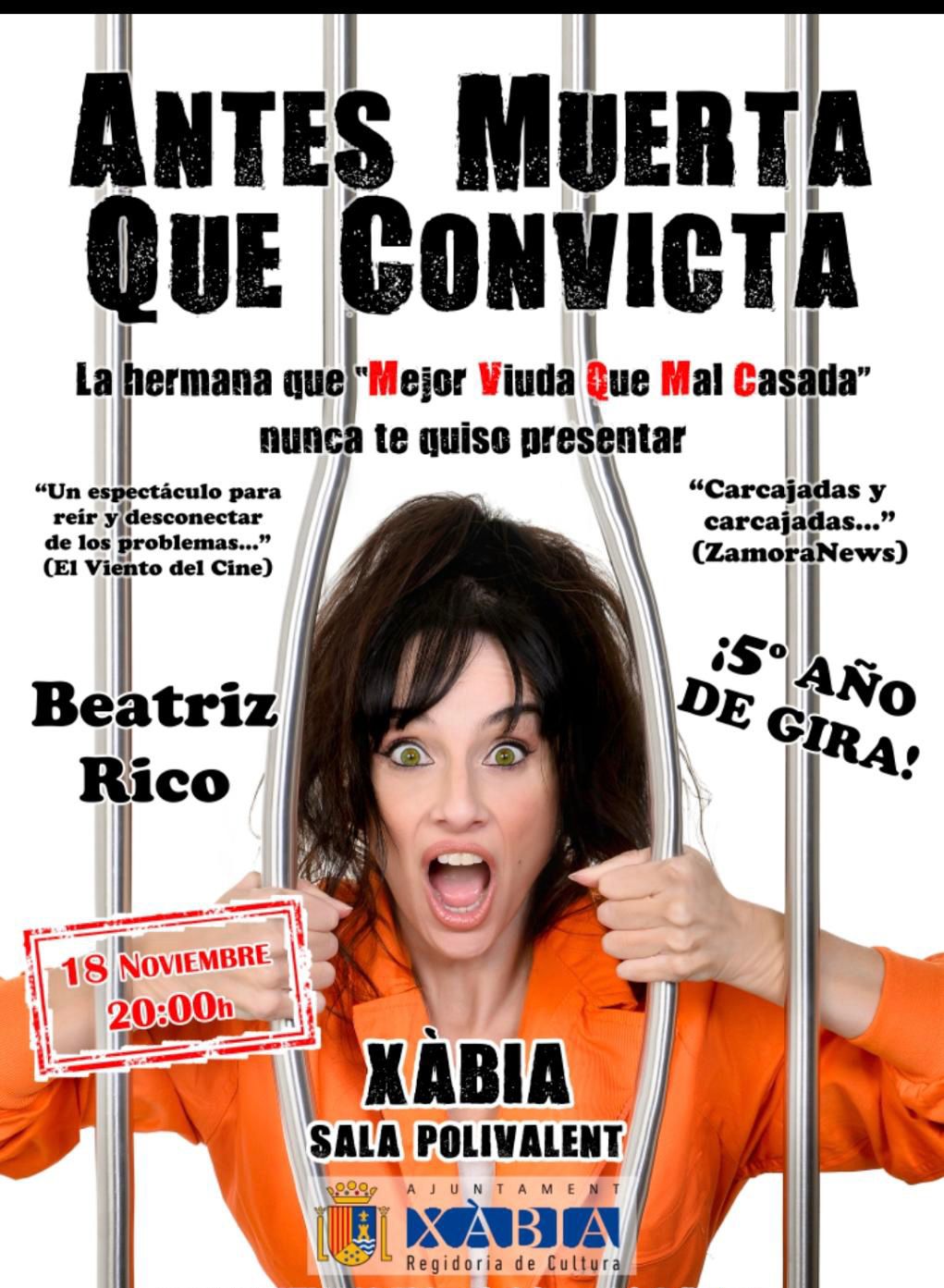 La conocida actriz Beatriz Rico presentará el próximo viernes, 18 de noviembre, en Xàbia su espectáculo cómico Antes muerta que convicta. El departamento de Cultura, dirigido por Quico Moragues, sigue apostando por incorporar a grandes figuras de la interpretación dentro de su programación teatral y, además, facilitar el acceso a la población con precios populares o la gratuidad de los espectáculos.