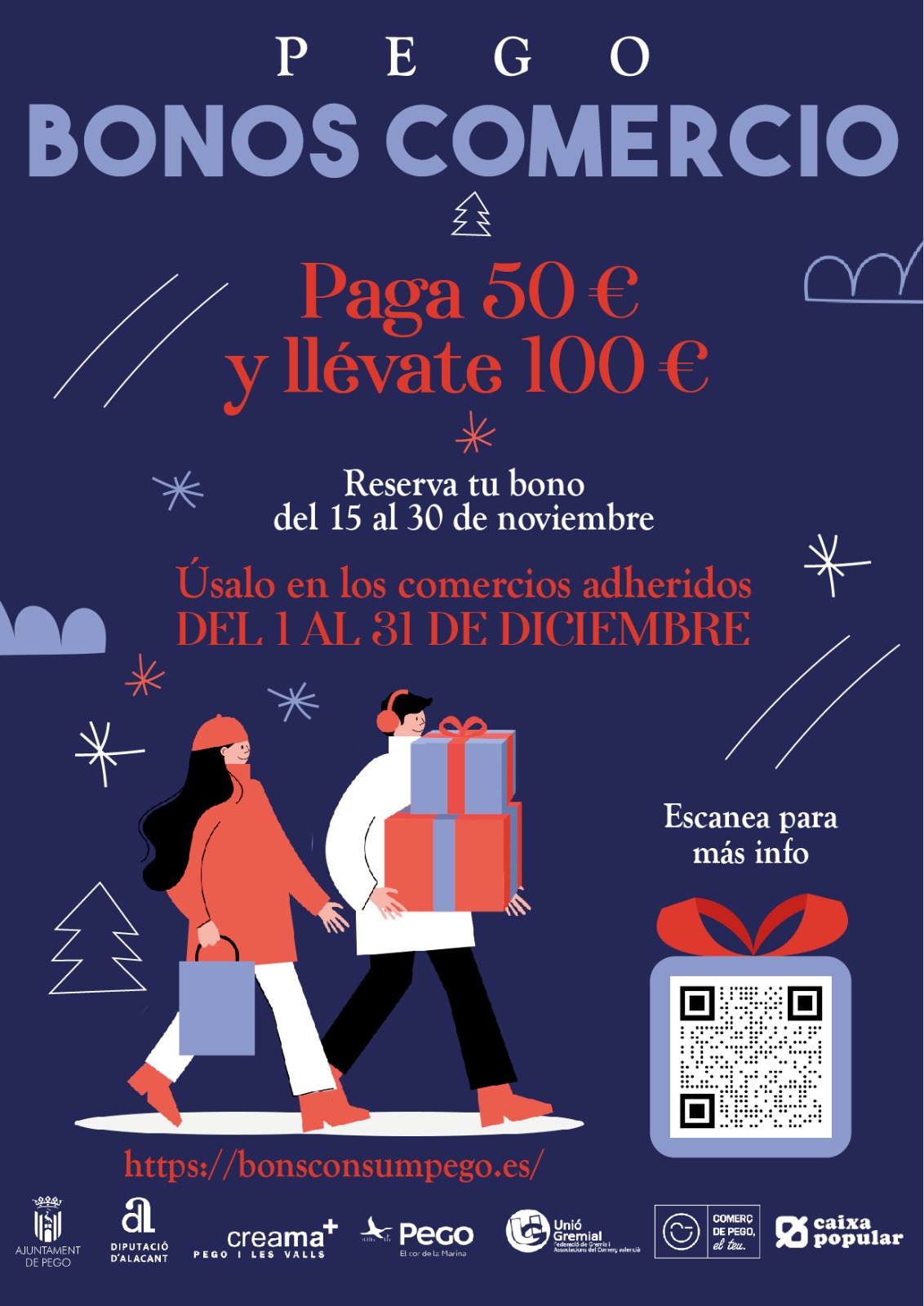 Pego ya ha puesto en circulación una edición navideña de los Bonos Comercio. Esto ha sido posible gracias a la firma de un convenio de colaboración entre el Ayuntamiento de Pego y Unió Gremial. Hasta el 30 de este mes, las personas que quieran adquirir su bono de comercio deberán coger cita a través de la página web bonscosumpego.es y abonar los 50 euros el día asignado. Será entre el 1 y el 31 de diciembre la fecha acordada para gastar 100 euros de la tarjeta.