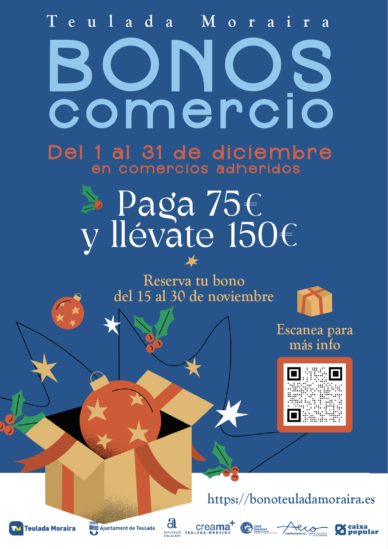El Ayuntamiento de Teulada impulsa la campaña de bonos para consumir en comercios y hostelería del municipio de cara a Navidad, con el fin de apoyar económicamente y fomentar la actividad del comercio local en estas fechas tan señaladas. Hasta el 25 de noviembre queda abierto el plazo de inscripción para que los negocios de Teulada Moraira se sumen a la iniciativa.