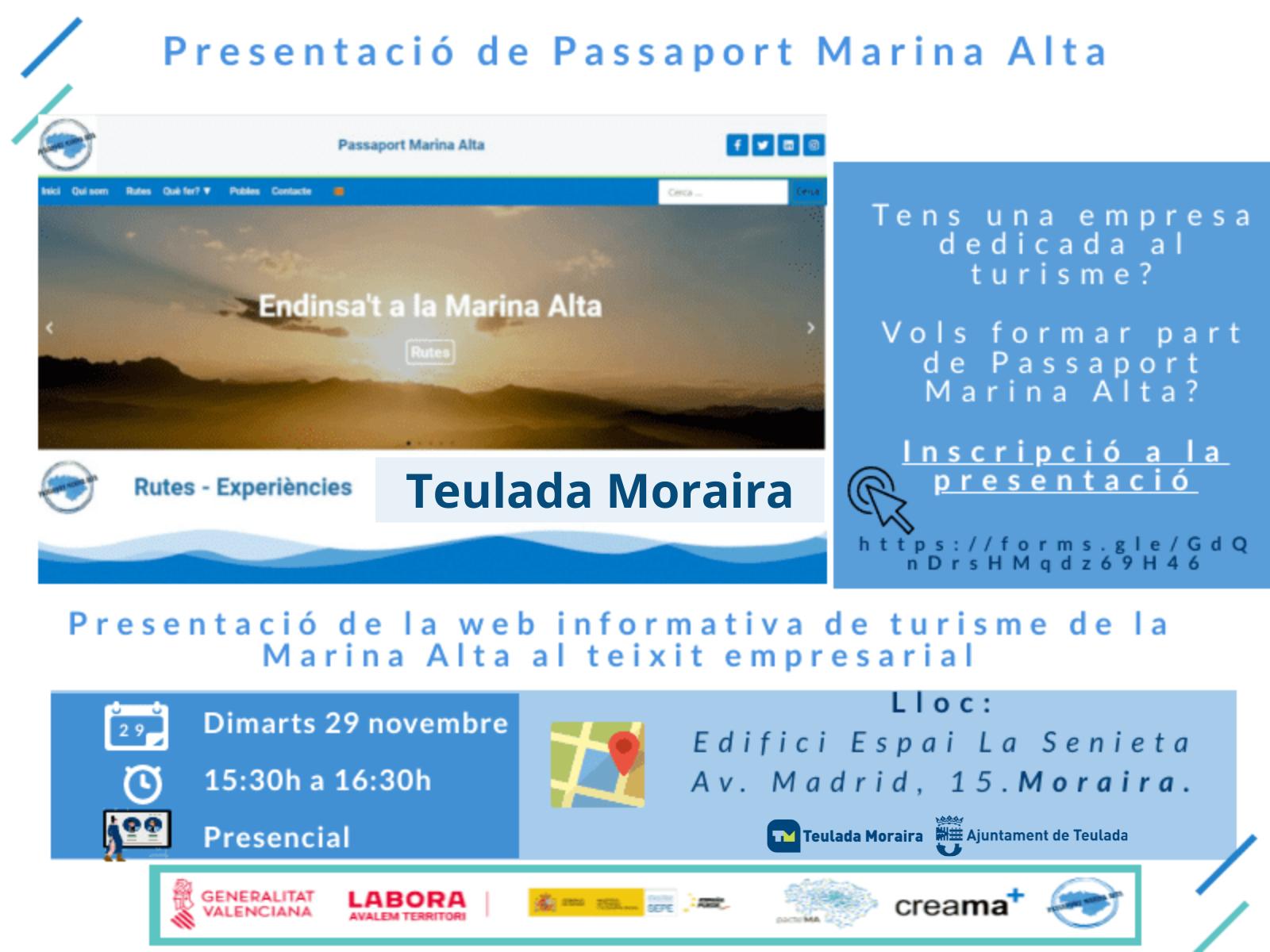 El Espai La Senieta de Moraira acogerá este martes, 29 de noviembre a las 15:30h, la presentación del proyecto Passaport Marina Alta al tejido empresarial del municipio. La exposición dará a conocer de primera mano el proyecto, sus objetivos y el procedimiento para darse de alta.