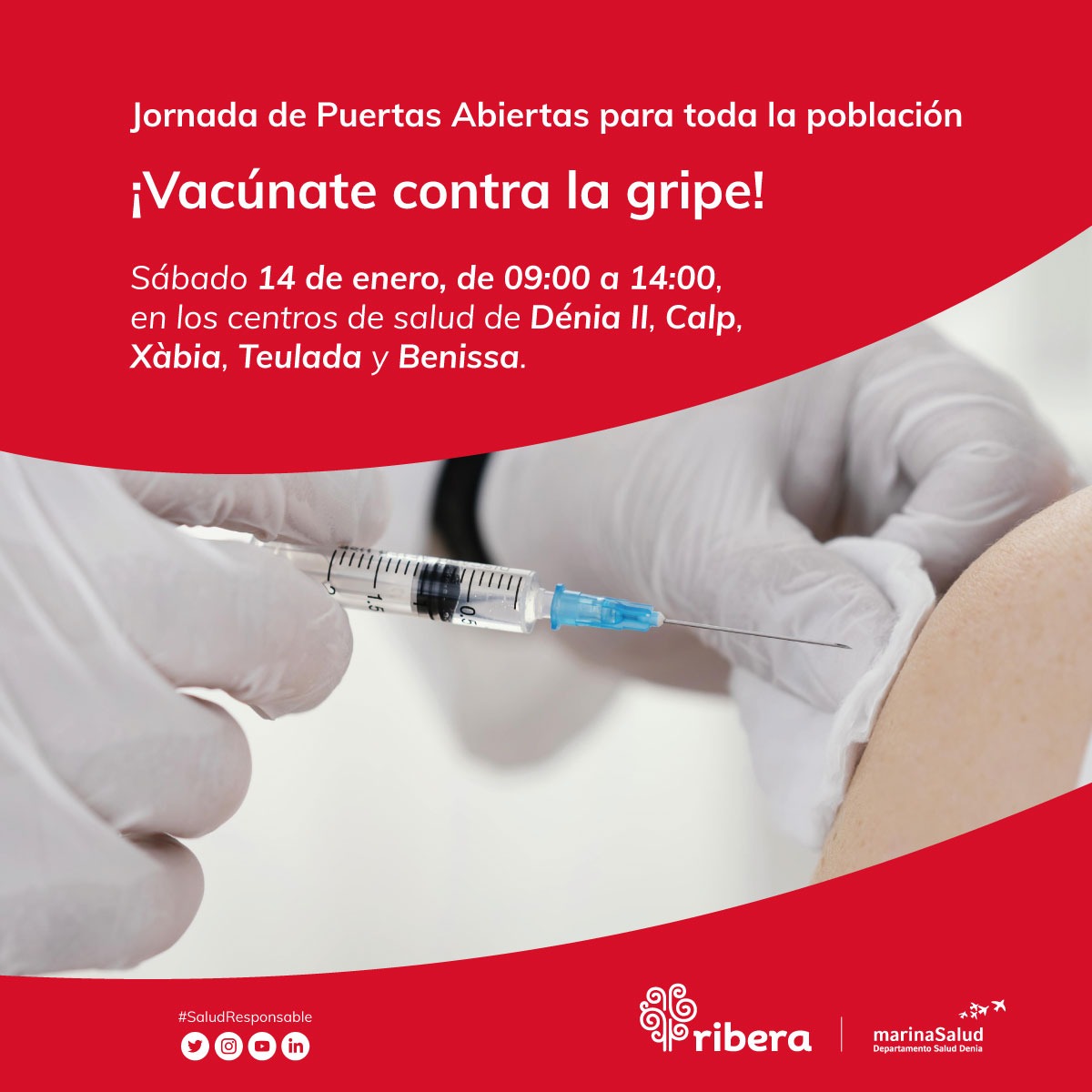 La campaña de vacunación contra la gripe esta en marcha en diversos municipios de la comarca. Xàbia, Calp, Benissa, Teulada y Dénia celebrarán una jornada de puertas abiertas para toda la población, será este próximo sábado de 9 a 14 horas. En el caso de Denia, hablamos únicamente del centro de la Calle Joan Fuster.