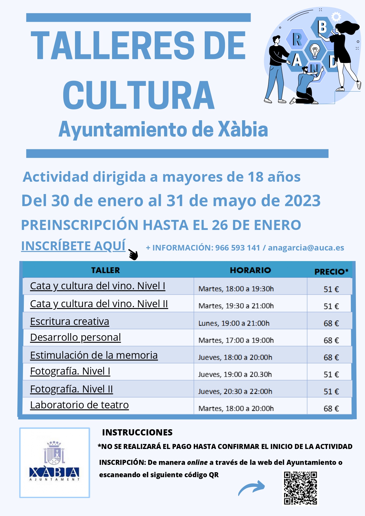 La concejalía de Cultura de Xàbia abre la inscripción para una serie de talleres dirigidos a mayores de 18 años. Hay cursos de cata y cultura del vino (en nivel iniciación y nivel intermedio), escritura creativa, desarrollo personal, estimulación de la memoria, fotografía (nivel I y nivel II) y laboratorio de teatro.