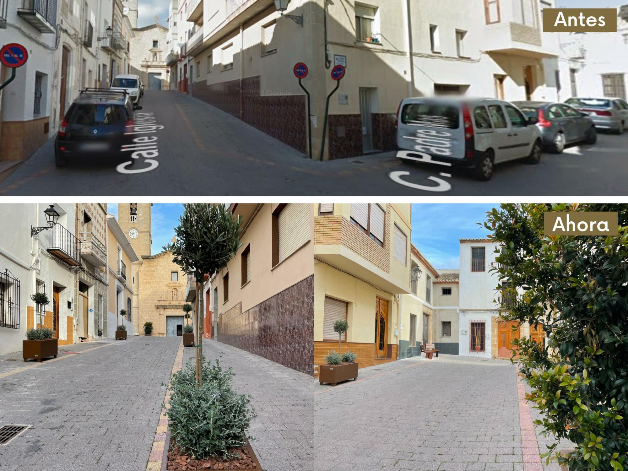 El antes y el después del aparcamiento junto a la iglesia / Ayuntamiento de El Poble Nou de Benitatxell