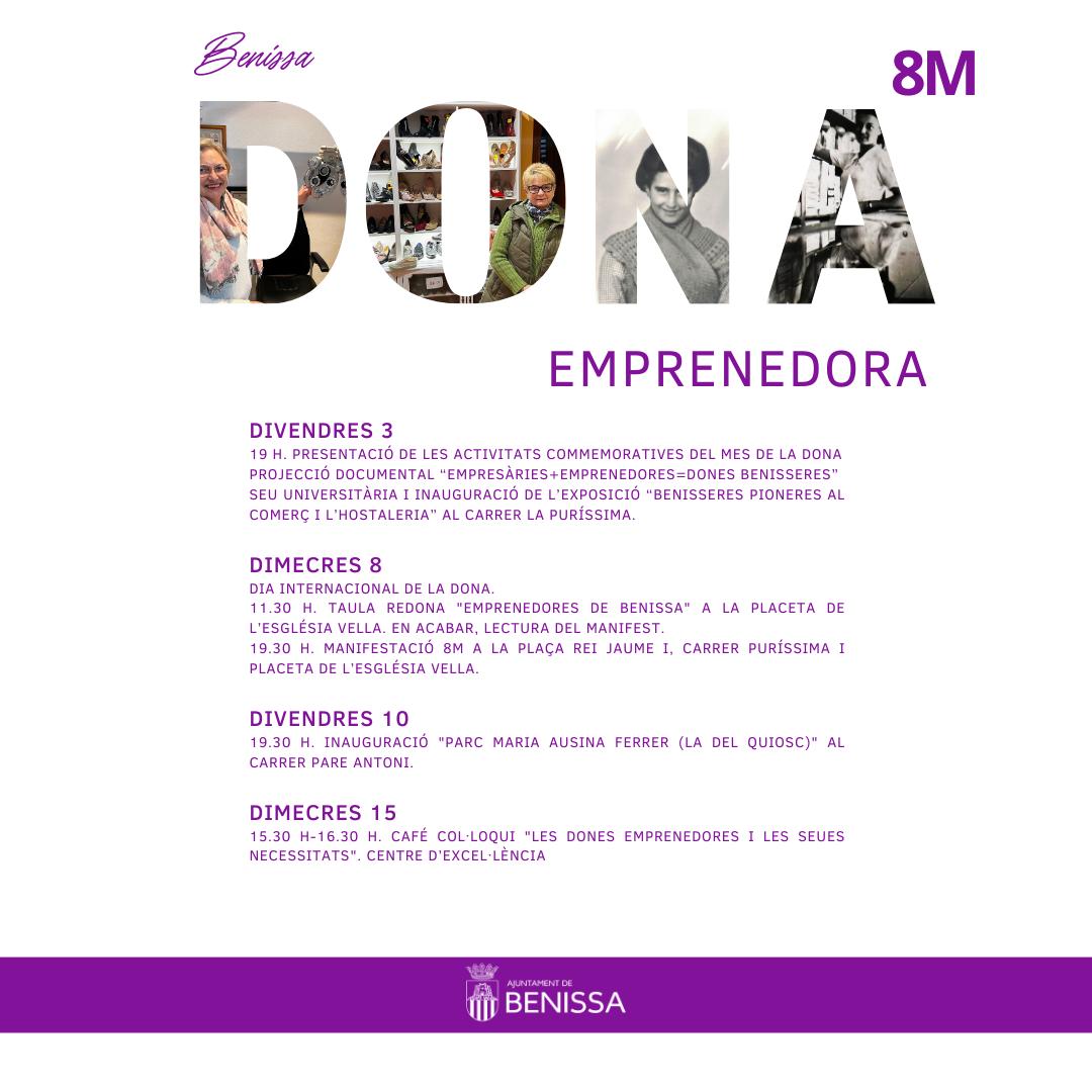 Por lo pronto, el viernes día 3 a las 19 horas en la Sede Universitaria de Benissa se presentarán todas las actividades y se proyectará el documental “Empresàries + Emprenedores = Dones Benisseres”. Una vez terminado el acto, se invitará a las personas asistentes a que visiten una exposición fotográfica sobre mujeres que emprendieron antes de 1980 negocios en el ámbito de la hostelería y el comercio.