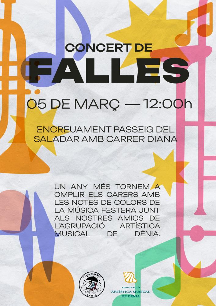 Vuelve a Dénia el Concierto de Fallas. Un evento que organiza la Falla Saladar conjuntamente con Fem Banda; el ya tradicional concierto de música festera dará la bienvenida a la semana fallera que tanto están esperando muchos. Será este domingo 5 de marzo a las 12 h en el cruce del paseo del Saladar con calle Diana.