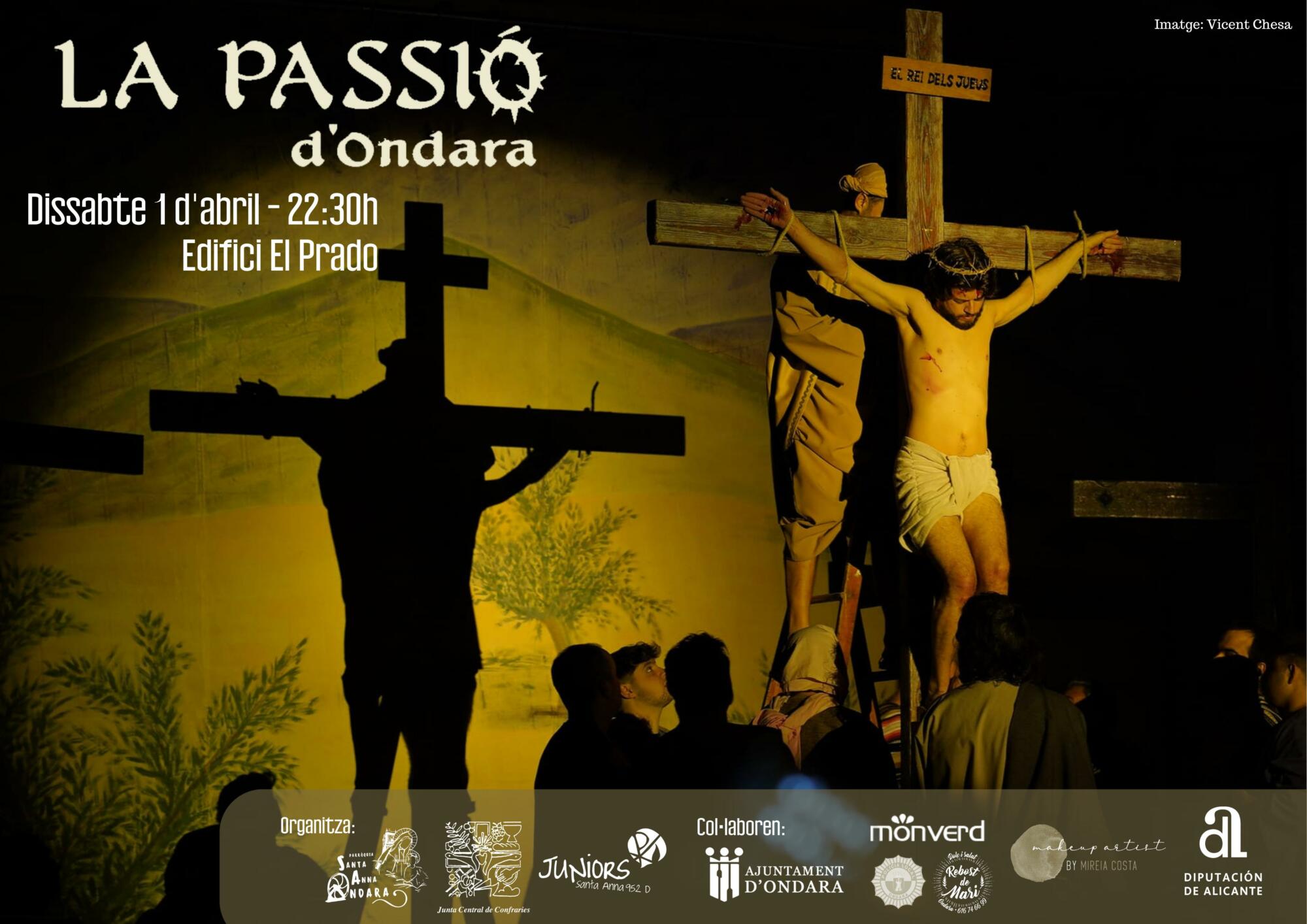 Esta emblemática representación teatral al aire libre, que se realiza íntegramente en valenciano, escenifica la Pasión y Muerte de Jesucristo. Se trata de un acto socio cultural de gran tradición y arraigo en la población, que se engloba en la programación de la Semana Santa de Ondara 2023, y que supone el primer acto de esta festividad en Ondara. La Pasión es un acto organizado conjuntamente por la Parroquia Santa Anna, la Junta Central de Cofradías, y el colectivo Júniors M.D; que cuenta también con la colaboración de la Concejalía de Fiestas y Tradiciones del Ayuntamiento de Ondara, y que se espera cuenta con la colaboración de la Diputación Provincial de Alicante.