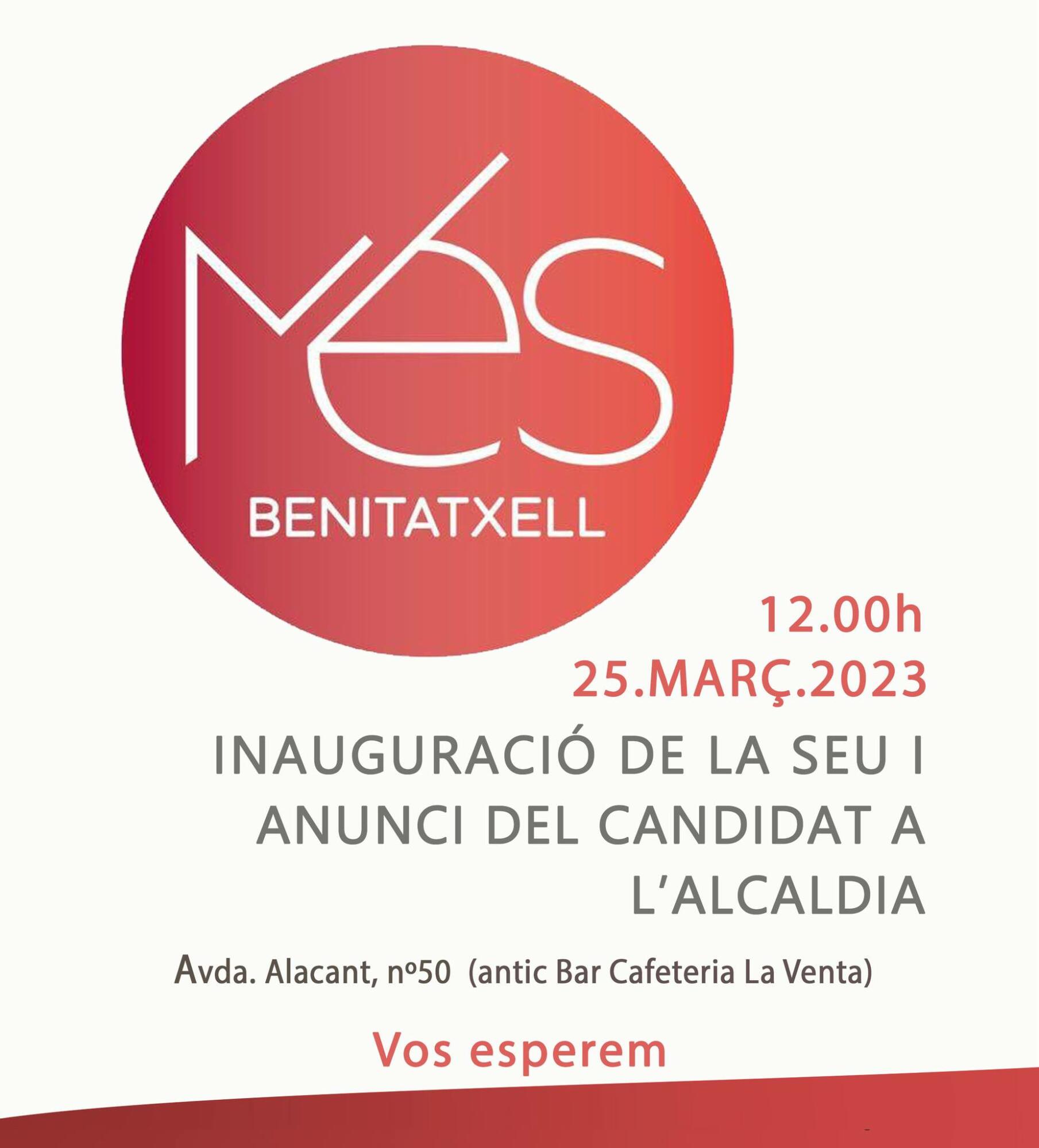 A tan solo dos meses de las elecciones municipales del 28 de mayo los partidos del Poble Nou de Benitatxell ya empiezan a moverse. El primero en hacerlo será el partido de la mayoría de integrantes del actual equipo de Gobierno, Més Benitatxell, el cual este sábado a las 12 horas inagurará su sede en la Avendia de Alicante n.º 50. Acto en el que también se dará a conocer de forma oficial quien será su candidato o candidata a la alcaldía poblera.