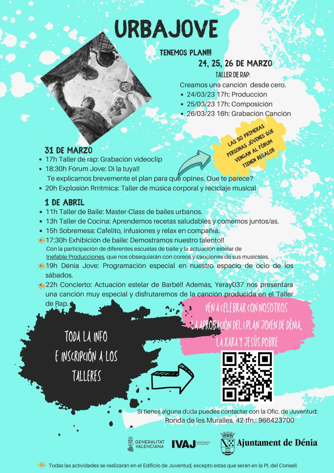 La Concejalía de Juventud ha organizado una nueva edición de Urbajove. Este año, el plan se ha rellenado de nuevas actividades para celebrar la redacción y aprobación del I Plan Joven de Dénia, la Xara y Jesús Pobre. La implantación de este plan, el cual pretende la mejora de las políticas públicas vinculadas a los jóvenes y la inclusión de los mismos en la agenda y el debate público, ha inspirado, según comentan desde la Concejalía, un conjunto de actividades de ocio para jóvenes de entre 12 y 30 años completamente gratuitas, ubicado, en su mayoría, a las instalaciones de Juventud (ronda de las Murallas, 42).