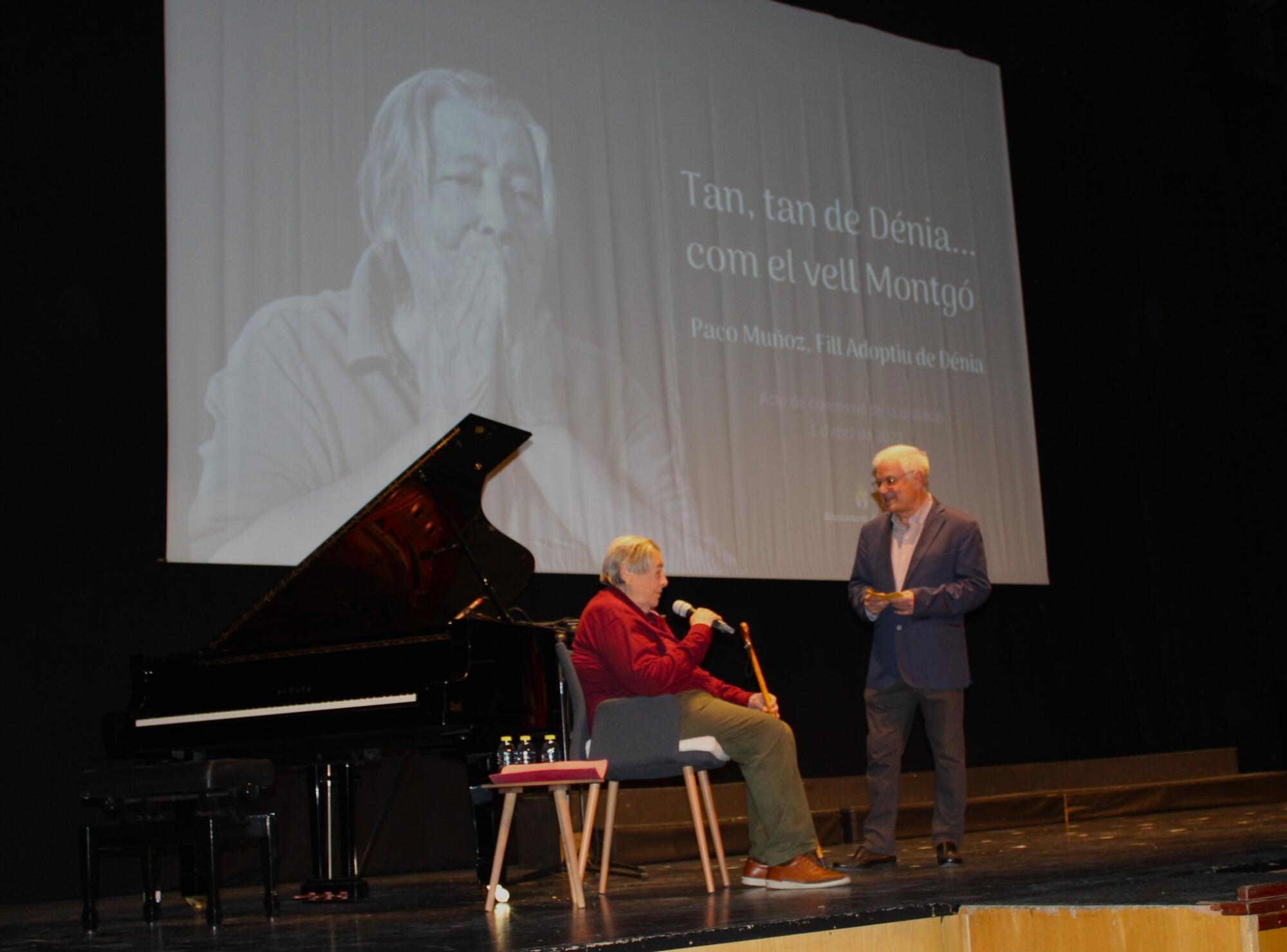 Paco Muñoz recibió el diploma de Hijo Adoptivo de la Ciudad de Dénia de manos de un gran amigo y admirador dianense, Vicent Pastor. También se le entregó la insignia de oro del Ayuntamiento de Dénia y firmó en el libro de honor de la ciudad escogiendo una estrofa de Hi ha una ciutat: t’estime, Dénia, t’estime amb desig d’enamorat. T’estime tant que voldria fer de la cançó un abraç, la misma composición que cantó anoche para el público.