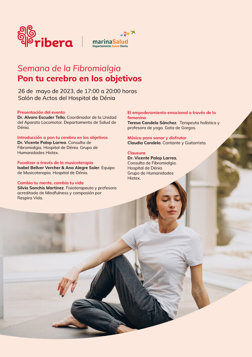 El Hospital de Dénia celebra la Semana de la Fibromialgia con talleres de yoga, mindfulness y música. Bajo el título de Pon tu cerebro en los objetivos el Dr. Palop, especialista en Fibromialgia del Departamento de Salud de Dénia, ha preparado una completa jornada para el próximo 26 de mayo, en el Salón de Actos del hospital.