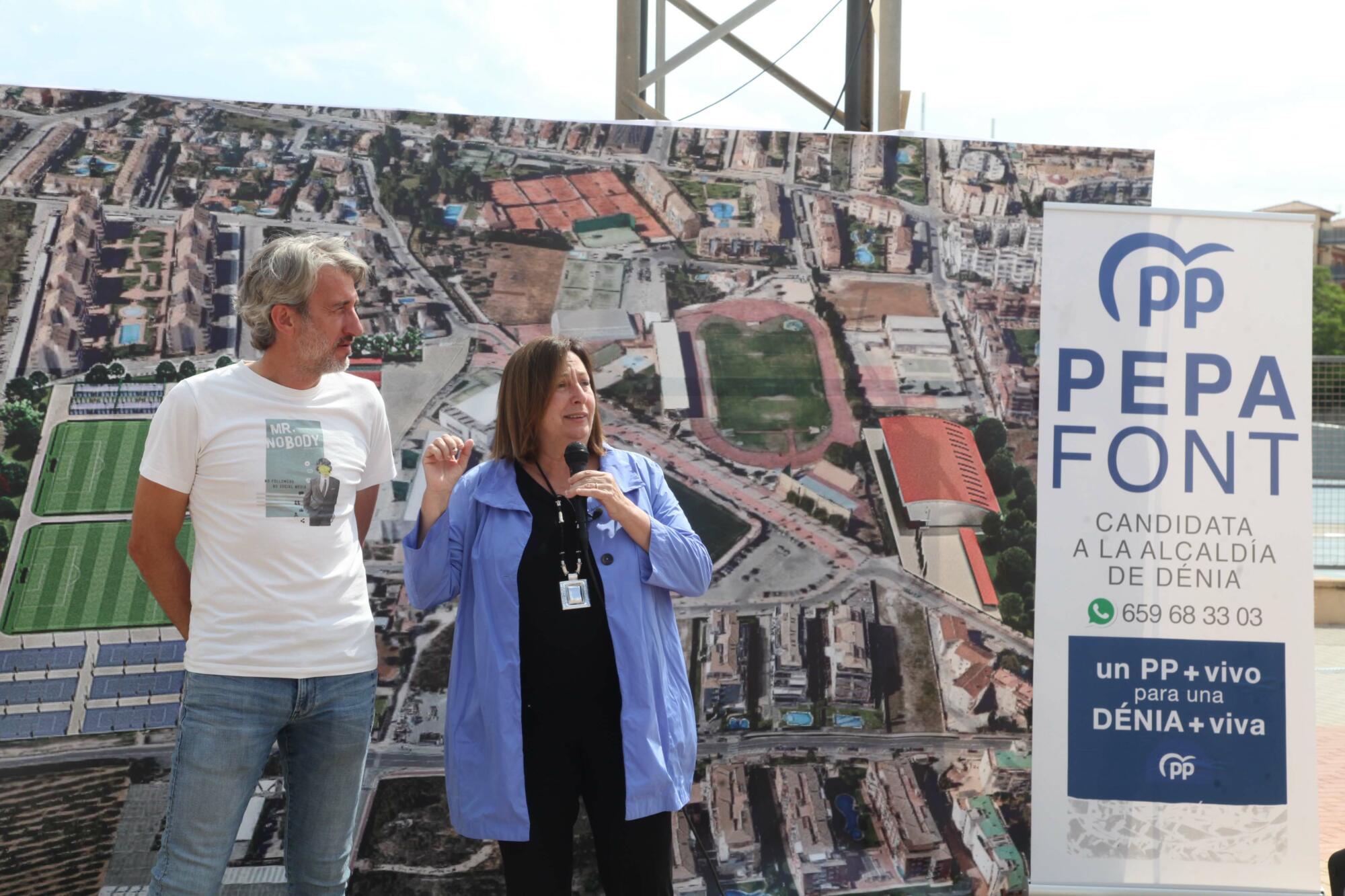 La candidata Popular a la alcaldía de Dénia, Pepa Font, y el número 3 de la candidatura y ex concejal de Deportes, Juan Carlos Signes, han presentado esta propuesta, a pie de pista del polideportivo.