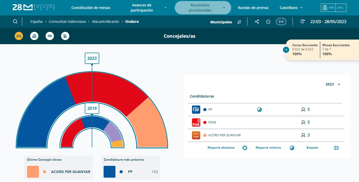 Ondara, 29.05.23. El Partit Popular va guanyar ahir  diumenge 28 de maig de 2023 les Eleccions Municipals a Ondara. Una ajustada victòria per 27 punts de diferència sobre el PSPV, el que es tradueix en un empat tècnic amb 5 regidors cada partit, i 3 regidors per a la tercera força política en vots, que va ser Compromís. A l’Ajuntament d’Ondara li corresponen 13 regidors.
