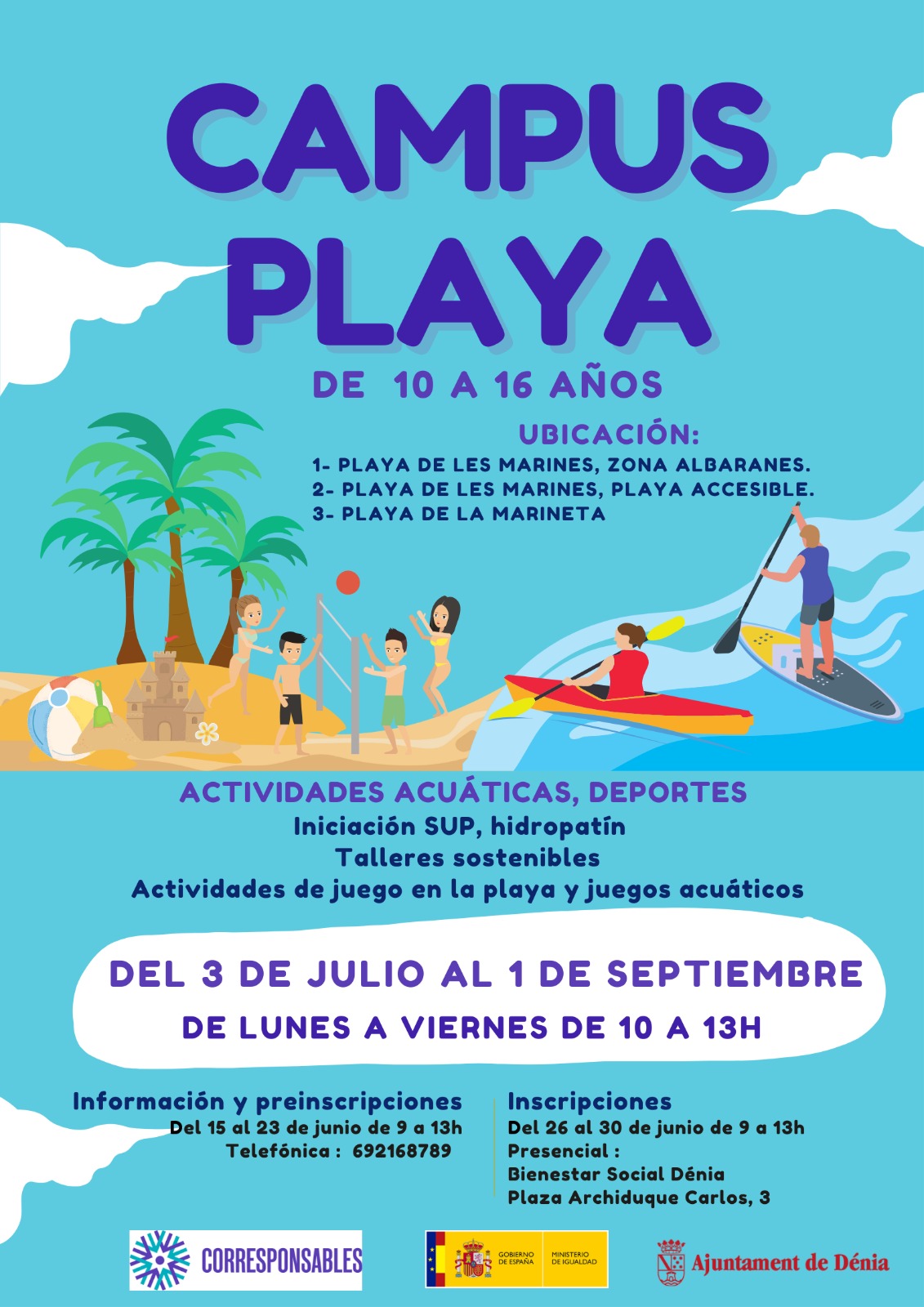 Con la intención de facilitar la conciliación laboral de los padres y madres, el área de Bienestar Social lanza el Campus Playa, entre el lunes 3 de julio y el viernes 1 de septiembre. Esta iniciativa gratuita se desarrollará simultáneamente en las playas de las Marines, Albaranes y Marineta Cassiana, donde grupos de 20 jóvenes de entre 10 y 16 años podrán disfrutar de actividades acuáticas (como hidropatí) y deportivas (como Stand Up Paddle), juegos o talleres sostenibles, de diez de la mañana a una del mediodía.