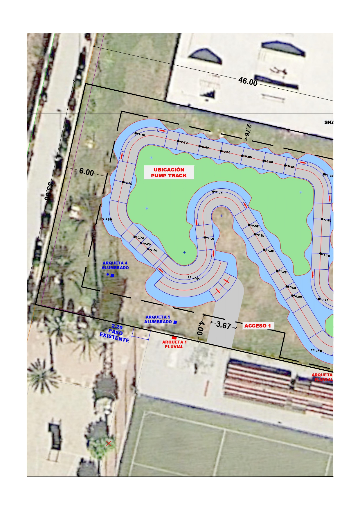 La pista proyectada tiene una longitud de 226 metros y una anchura de 2,50 metros, acabada con pavimento de aglomerado asfáltico, color negro, terminando los taludes e islas interiores con hormigón en masa. El circuito contará con mesetas, elevaciones, ondulaciones, peraltes y taludes necesarios adecuados a las dimensiones y trazado del circuito.