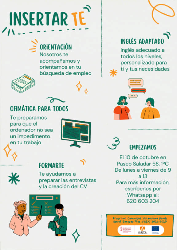 Arranca el inicio del Programa INSERTARTE, programa subvencionado por la Comunitat Valenciana y el Fondo Social Europeo Plus (FSE+) 2021-2027. Este programa consta de formación para personas en riesgo de exclusión social y es totalmente gratuita. Las inscripciones se abrirán a partir del 25 de septiembre, a través de whatsapp al 620603204 o mail a adahma@hotmail.com, enviando nombre y teléfono.