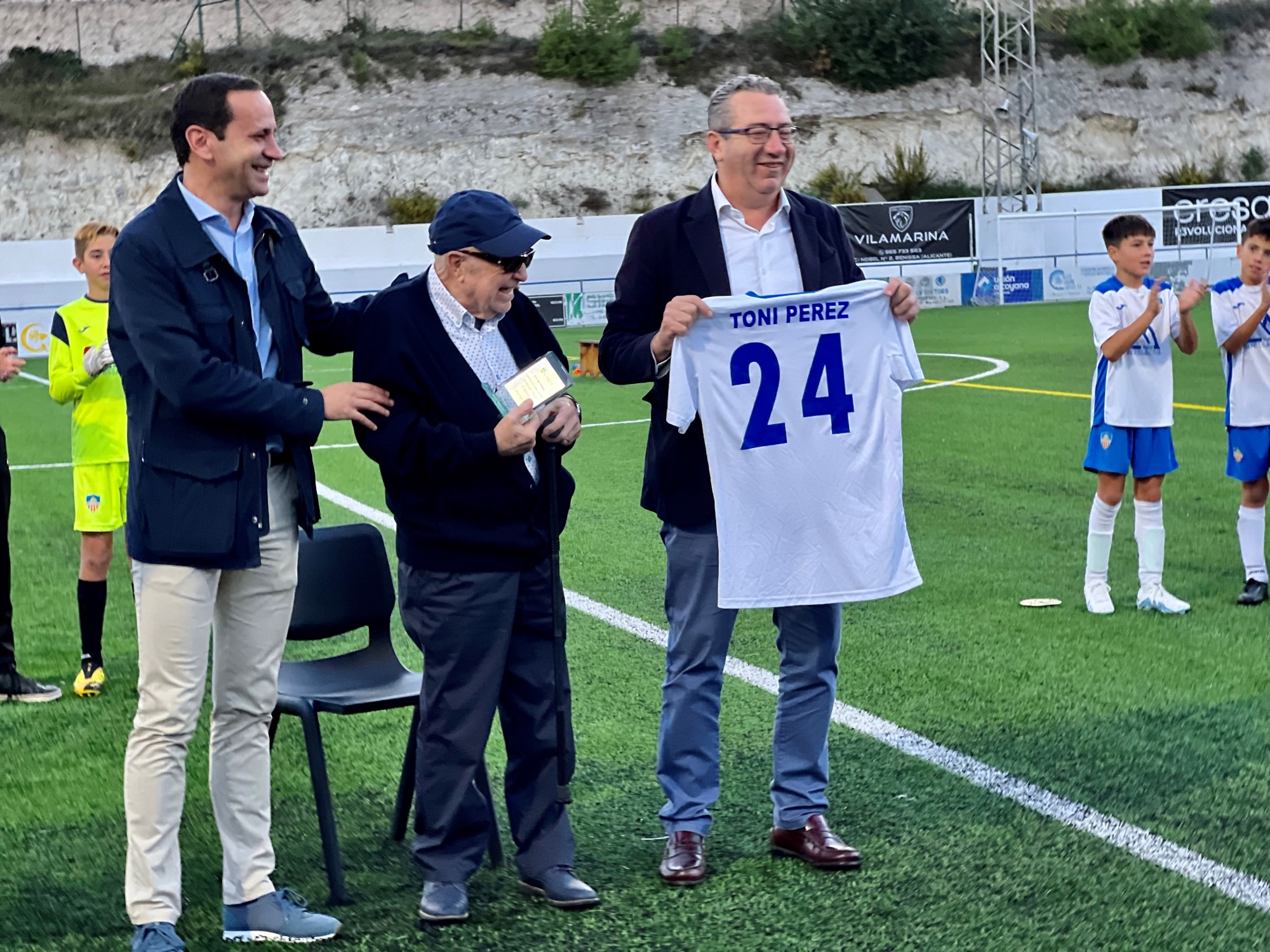 El presidente provincial acompañó al socio más antiguo de la UD Benissa, Juan Femenía, en el saque de honor, Pérez recibió una camiseta de la entidad deportiva de manos del primer edil. Al acto también asistió el concejal de Deportes, Adrián Cabrera.