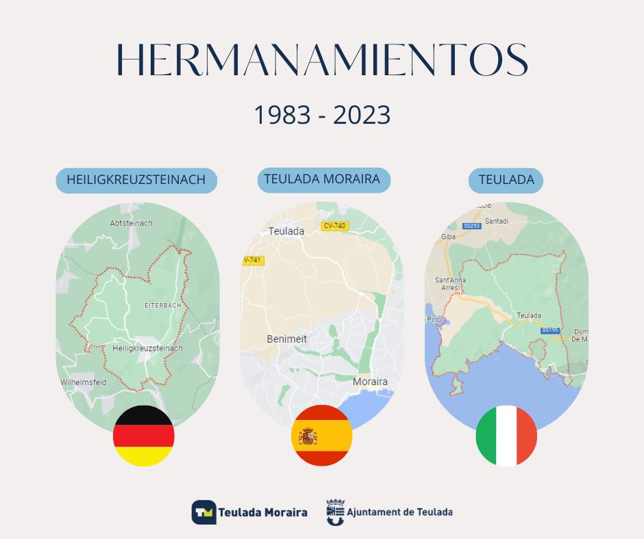 Cabe recordar que dichos hermanamientos tienen origen en la década de los 80. El primer hermanamiento surgió con el pueblo alemán de Heiligkreuzsteinach, a raíz de la amistad entre Pablo y Gisela Katzgrau con Salvador Oliver, entonces presidente de la Agrupación Musical Cultural de Teulada.