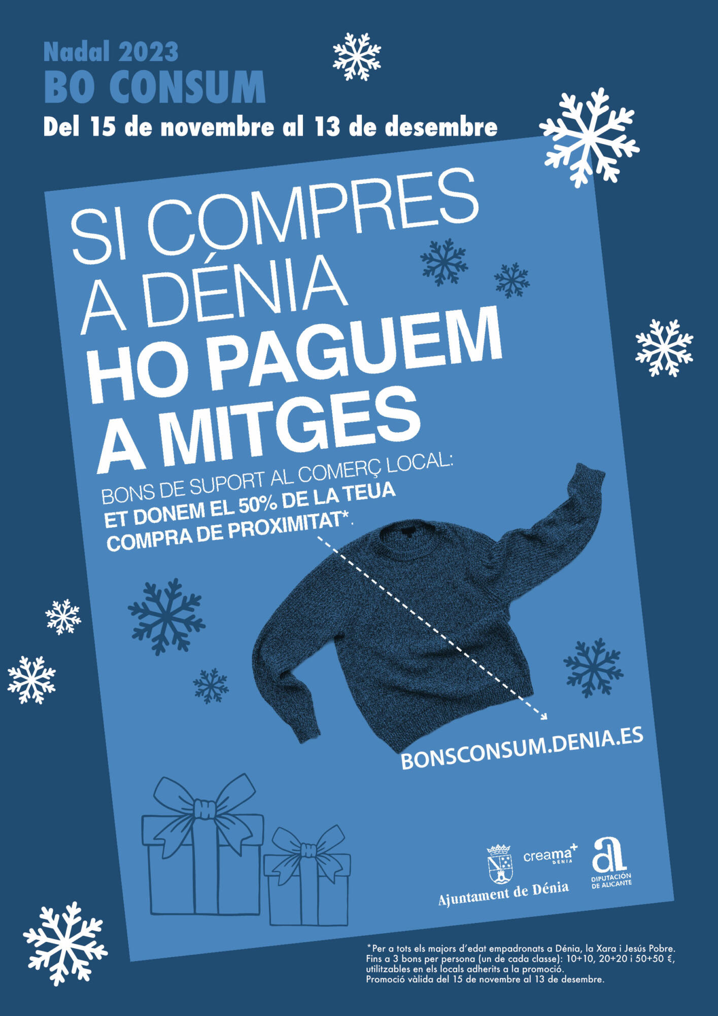 El Ajuntament de Dénia, a través de la Concejalía de Comercio, junto con Creama Dénia y las EATIM de La Xara y Jesús Pobre, ponen en marcha una nueva edición de la campaña “Bono Consumo Navidad” con el fin de estimular las compras navideñas en los comercios y establecimientos de Dénia, La Xara y Jesús Pobre. La nueva campaña comienza el 15 de noviembre y terminará el 13 de diciembre.