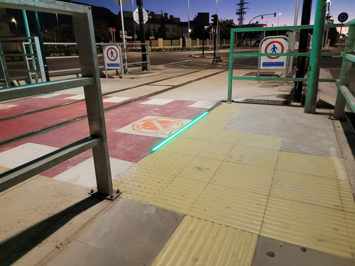 Además, se incorpora una línea de iluminación LED empotrada en el suelo que se sincroniza con el funcionamiento del semáforo, cambiando de color según la proximidad del convoy.