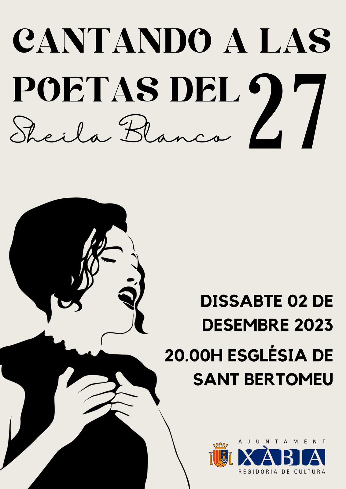 Per la seua part, a les 20.00 hores del dia 2 de desembre, Sheila Blanco ofereix el seu recital també a l’Església de Sant Bartomeu. Blanco posa veu i ritme a una selecció d’autores de la generació literària del 27, interpretant una música que aprofundeix en les emocions que impregnen els poemaris i aborden temes universals, personalitzats en les vides de cadascuna d’elles com són l’amor, dolor, exili, bellesa, la pena o el remordiment.