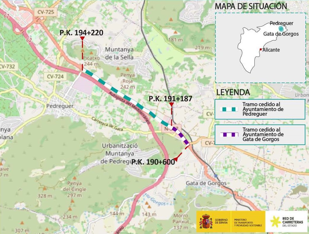 • Tramo objeto de cesión al Ayuntamiento de Pedreguer: entre el kilómetro 191,187 (límite con el término municipal de Gata de Gorgos) y el 194,220 (enlace del polígono industrial Les Galgues/ Pedreguer).