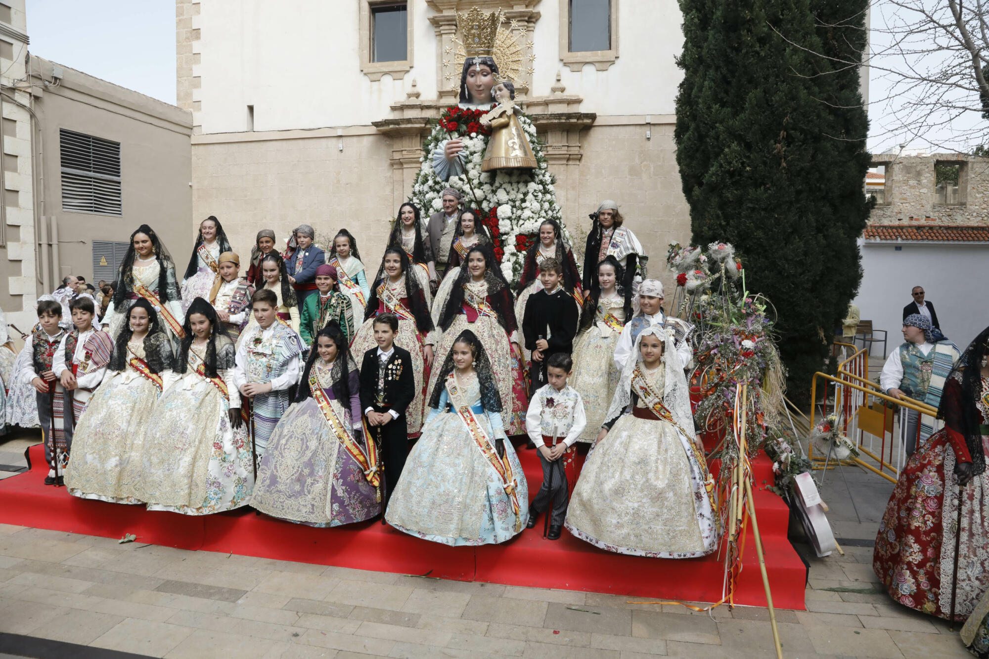 La Comissió de Festes de la Mare de Déu abrió la ofrenda; y es que sus representantes son los encargados de confeccionar el manto de la Virgen, con los ramos de claveles blancos y rojos que portan las falleras.
