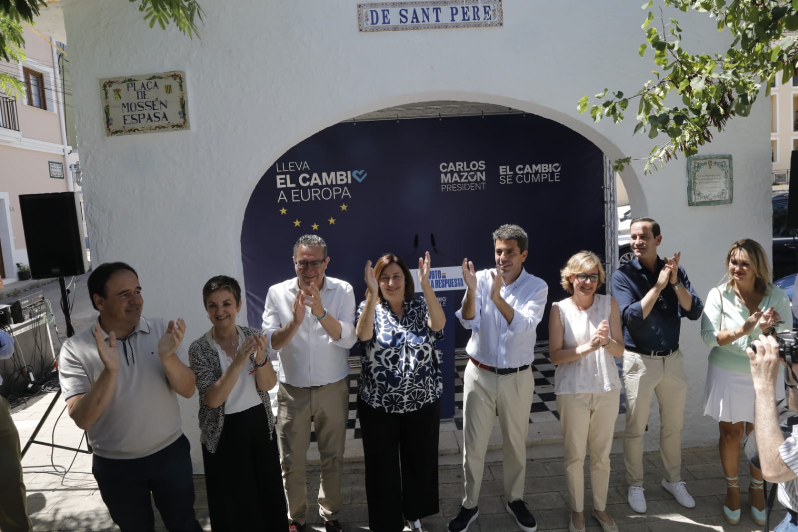 La plaça Mossen Espasa en La Pedrera, a Dénia, ha acollit, aquest migdia, l‘acte comarcal del PP a les eleccions al Parlament Europeu del pròxim 9 de juny, amb la participació del president del PPCV i de la GVA, Carlos Mazón; el president del PP en la província d’Alacant i de la Diputació, Toni Pérez; i la presidenta de la gestora del PP a Dénia, Pepa Font.
