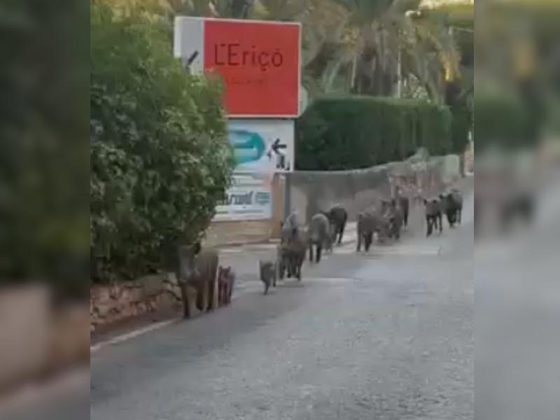 Més de 15 senglars corren a pler en la carretera de Les Rotes, a Dénia. El vídeo que ocupa les xarxes socials a la comarca ha sigut gravat este mateix matí (@jose__1997) davant l’atenta mirada dels conductors que circulaven per la calçada.