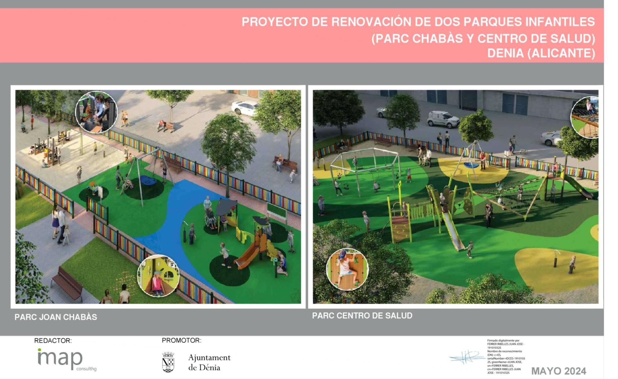 El projecte per a renovar els parcs infantils del Centre de Salut i el parc Chabàs es licitarà pròximament amb un pressupost de 170.299 euros. En el cas del Centre de Salut, es preveu una renovació completa del paviment de cautxú, a més d’una ampliació de la zona de jocs. També s’instal·larà una nova tanca perimetral per a garantir la seguretat dels xiquets. Els nous elements de joc seran més grans i moderns, afavorint el joc actiu. «Inclourem un ‘hexacolumpio’, que oferirà engrunsadores adaptades a diferents edats», segons les declaracions dels responsables del projecte.