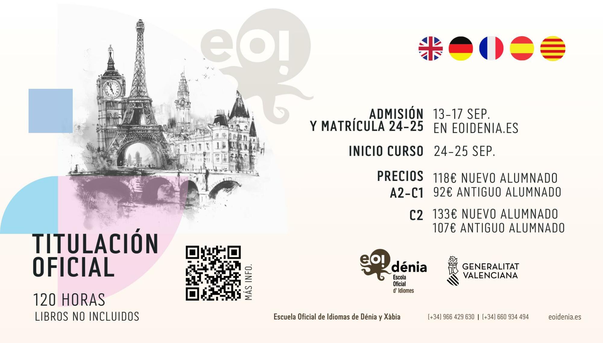 Per a obtindre més informació o resoldre dubtes, els interessats poden acudir directament a l’EOI de Dénia, situada al carrer Hiades, 10, o visitar la seua pàgina web (www.eoidenia.es). També és possible contactar per telèfon al 966 42 96 30 o 660 934 494, o mitjançant correu electrònic a 03018283.secretaria@edu.gva.es.