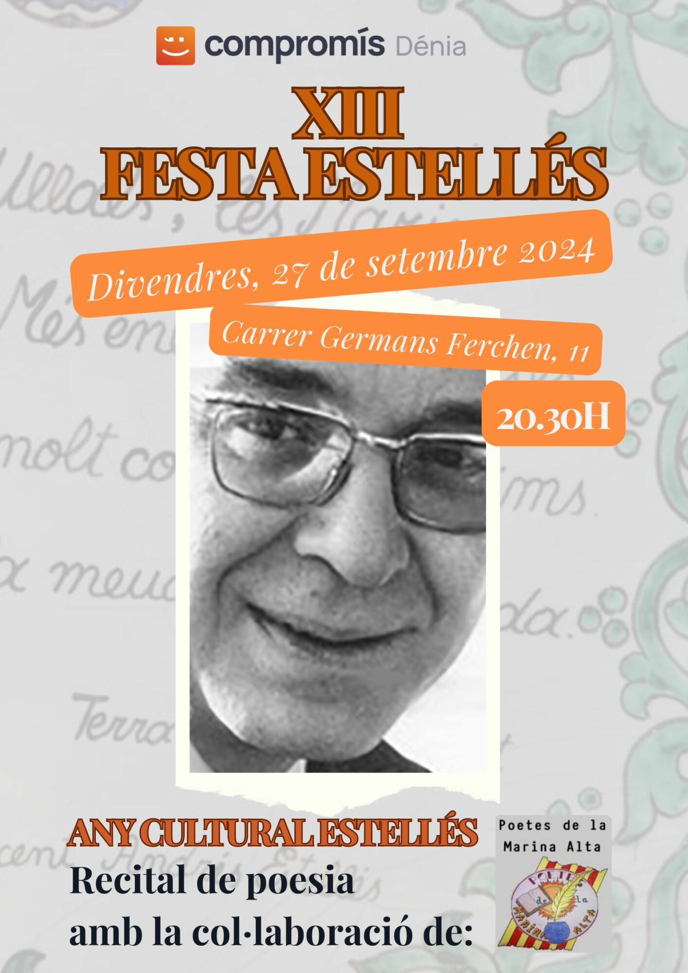 Compromís per Dénia ha anunciat la celebració de la tretzena edició de la tradicional Festa Estellés, en homenatge al reconegut poeta valencià Vicent Andrés Estellés. L’esdeveniment tindrà lloc el pròxim divendres 27 de setembre a les 20.30 hores al carrer Germans Ferchen 11, davant la seu de Compromís per Dénia, i comptarà amb la col·laboració especial del grup cultural Poetes de la Marina.