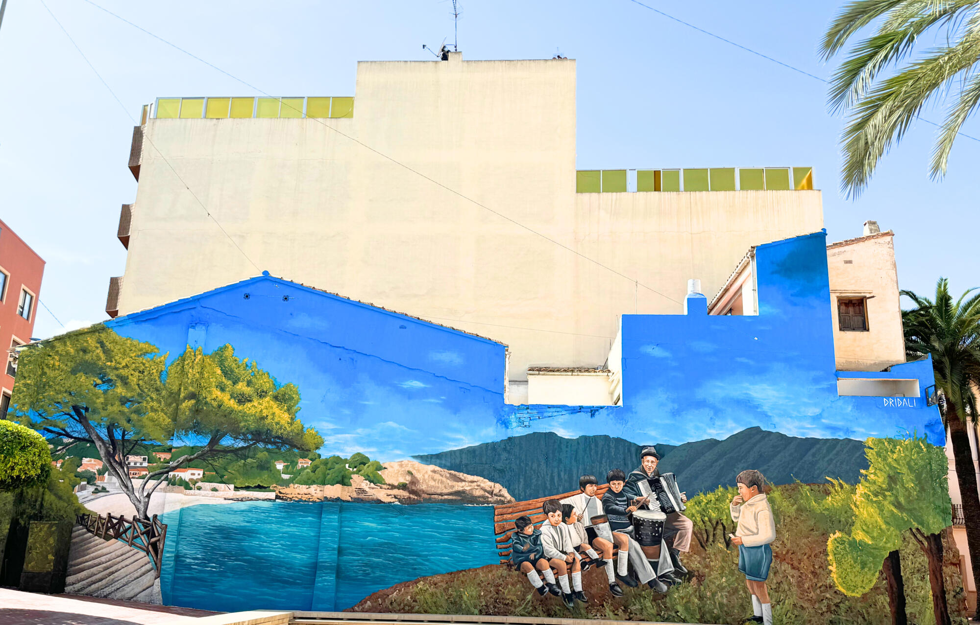 Dridali ha convertit la paret en un homenatge als espais naturals més emblemàtics de Benissa, com el passeig ecològic que arriba fins a la platja de la Fustera i la majestuosa serra de Bèrnia. A més, l’artista ha capturat un moment molt significatiu per als habitants de Benissa: la figura de Pere Bigot tocant l’acordió, rodejat de xiquets del poble. Aquesta escena, extreta d’una fotografia del conegut barber Miguel Giner, destaca pel seu caràcter entranyable i representa la connexió intergeneracional de la comunitat.