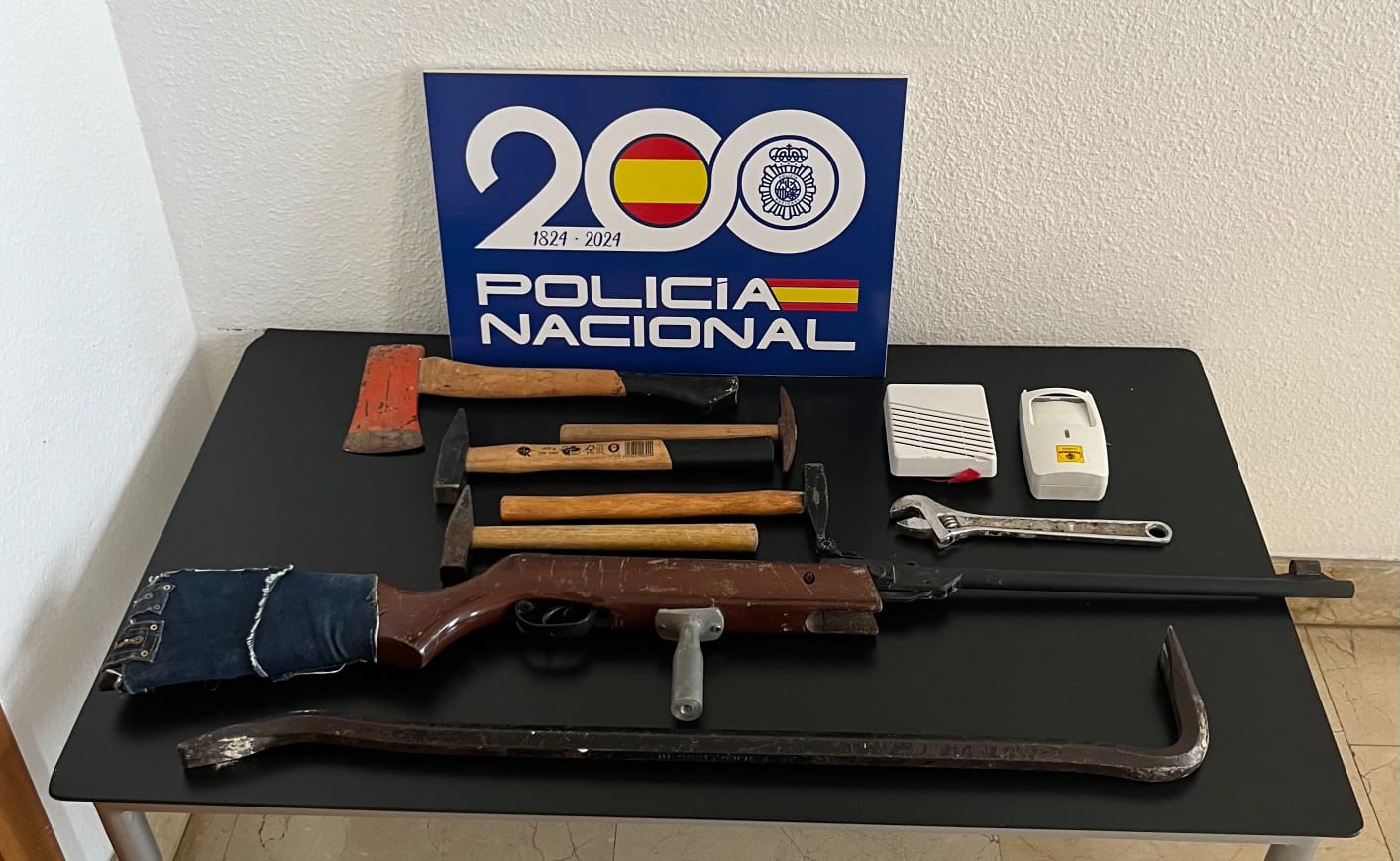 La Policia Nacional va localitzar als presumptes autors al jardí de la vivenda. En la revisió de l’interior del xalet, es van trobar ferramentes ocultes sota un llit, compatibles amb els danys causats a les portes d’accés, la terrassa i altres àrees de l’immoble. També es va trobar una carabina d’aire comprimit i elements del sistema d’alarma de la propietat, com un sensor i una sirena, tots dos danyats i amb els cables tallats.