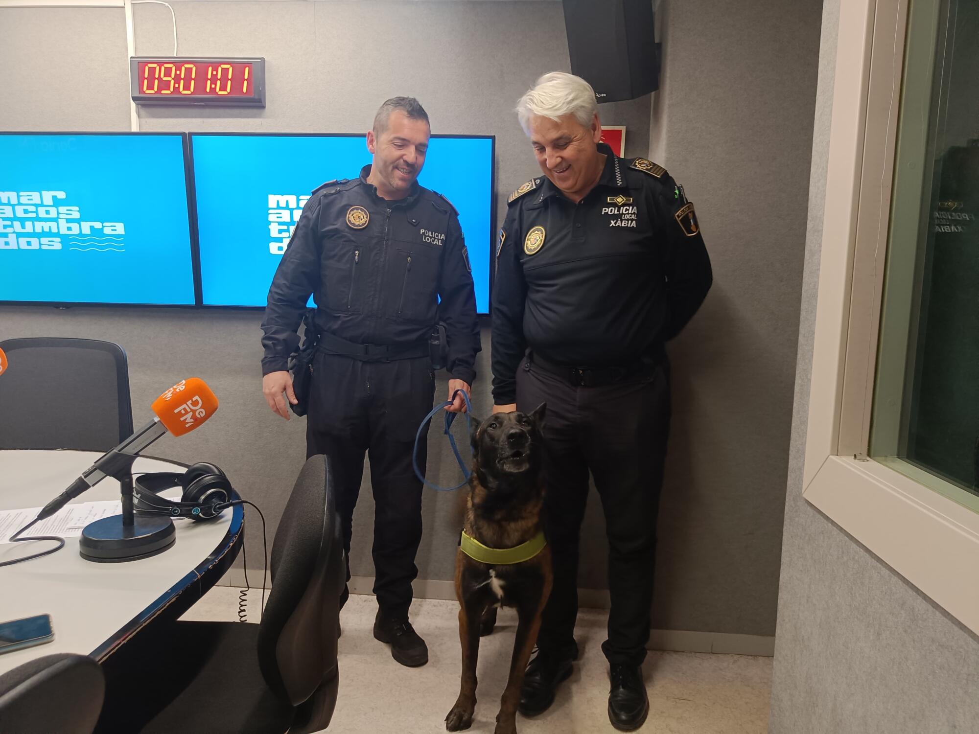 Precisament Khalan ha visitat els estudis de Dénia FM, juntament amb el seu guia caní Alberto Reyes Romero i José Antonio Monfort, Intendent Cap de la Policia Local de Xàbia.