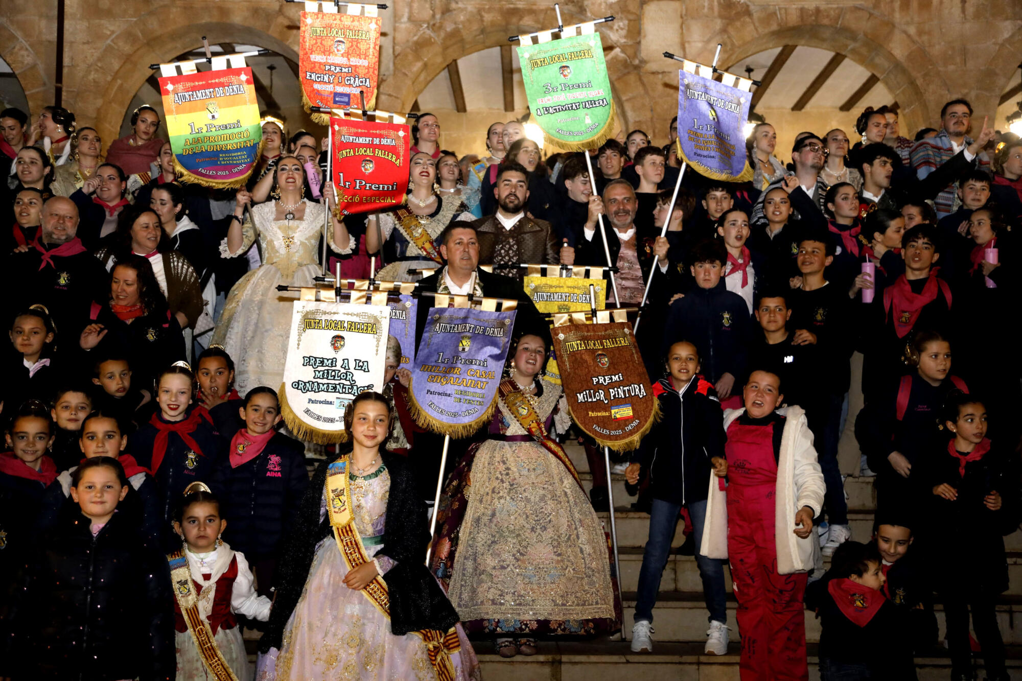 El acto estuvo presidido por la Fallera Mayor de Dénia, Carla Puerto ; mientras que la plaza de la Constitución volvió a llenarse de falleros de las once comisiones para recibir a sus presidentes y falleras mayores conforme bajaran del edificio consistorial.