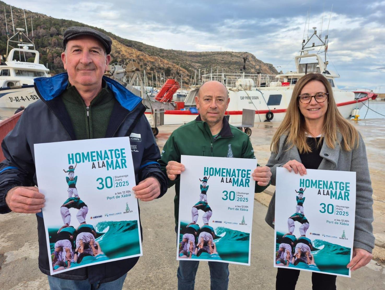La concejala de Cultura, Mavi Pérez, junto con Amadeu Ros, en representación de la Cofradía de Pescadores, y Pepe Signes, vicepresidente de la Muixeranga de la Marina Alta, han presentado el cartel oficial del evento.