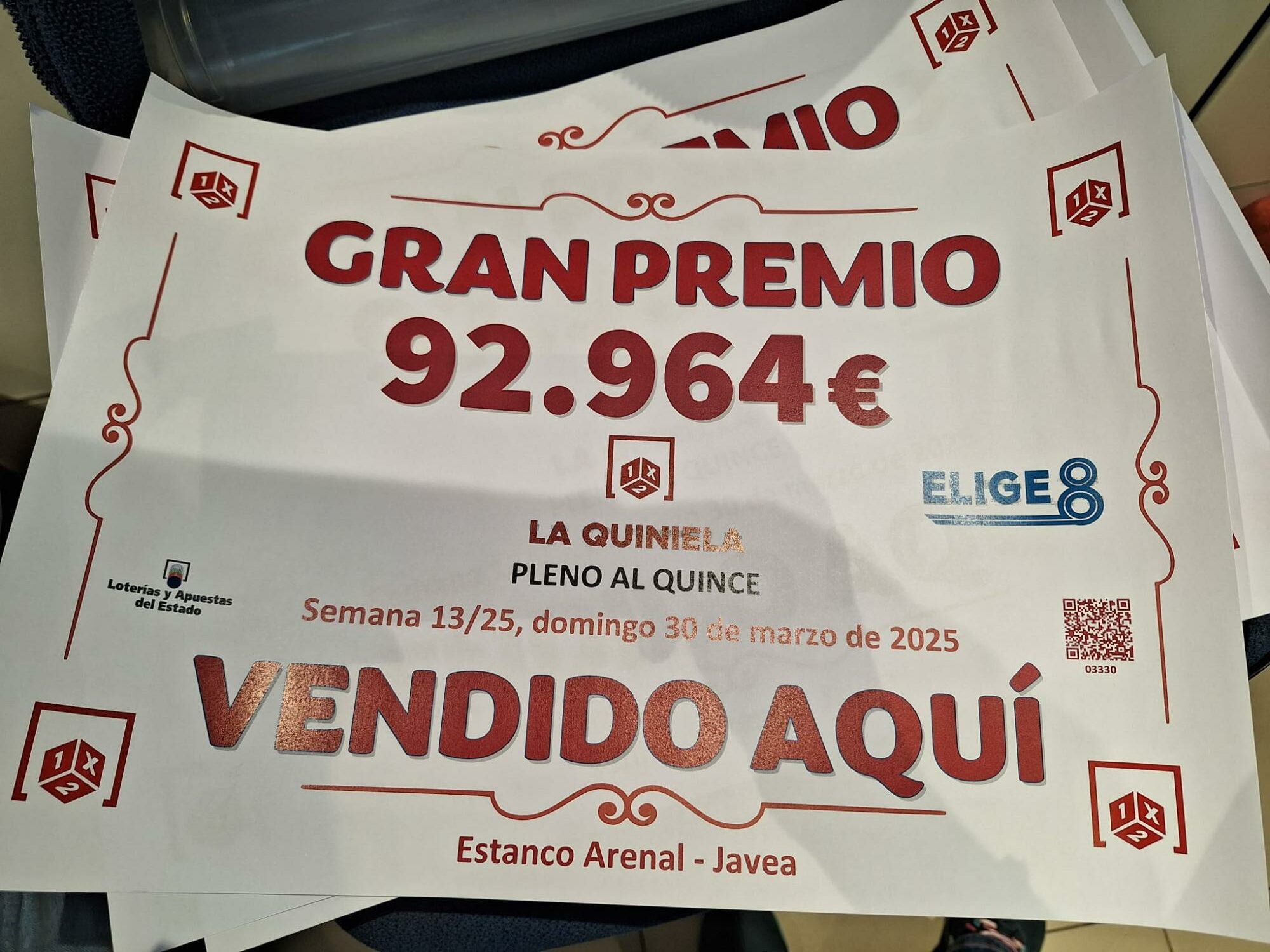 Un premio de 97.058,24 euros ha sido repartido en Xàbia, tras un afortunado acertante que logró la combinación ganadora en la quiniela del Pleno del Quince. La cifra corresponde tanto al importe del pleno, de 92.964 euros, como a una suma adicional por acertar 14 de los 15 partidos pronosticados. La suerte, en este caso, ha sido repartida por Loterías Arenal, en la avenida Libertad de Xàbia.