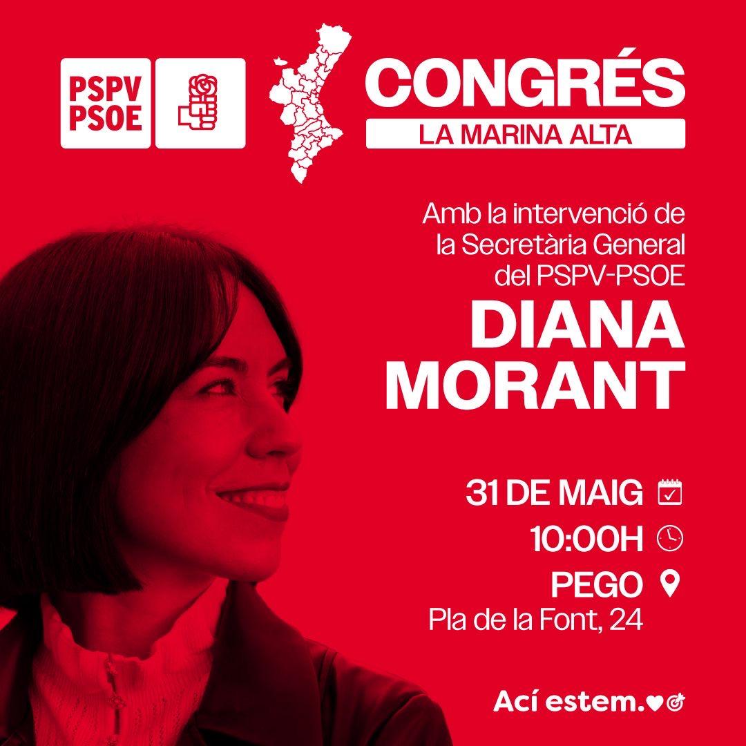 Este sábado, 31 de mayo, a las 10 horas, la ministra de Ciencia, Innovación y Universidades y Secretaria General del PSPV-PSOE, Diana Morant, participará en la apertura del Congreso Comarcal de los socialistas de la Marina Alta, en Pego.