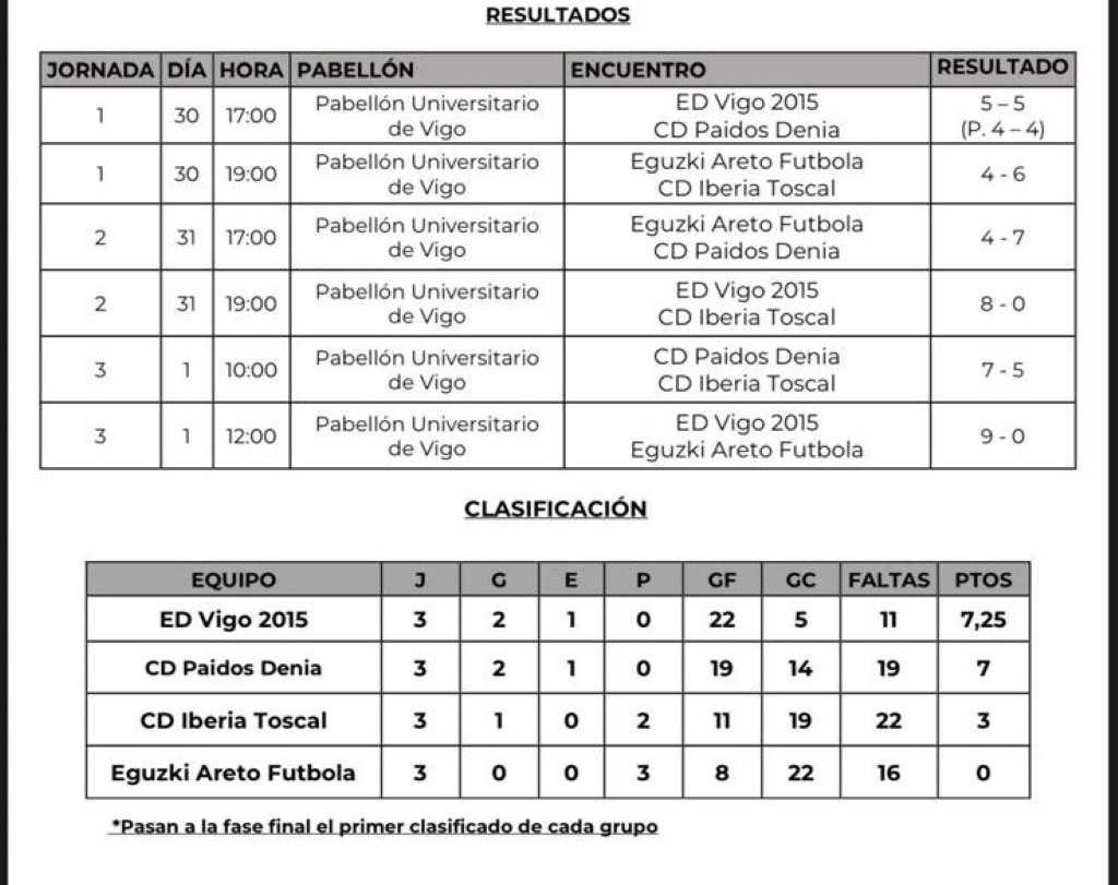 El CD Paidos Dénia regresó imbatido del Campeonato de España Sub 16 de fútbol sala, pero no logró alcanzar la tan ansiada Final Four, donde se disputan los 4 mejores equipos nacionales. El empate a 4 ante el SD Vigo 2015, con un gol encajado a falta de 12 segundos para el final, resultó decisivo para que los dianenses no pudieran estar entre los finalistas.