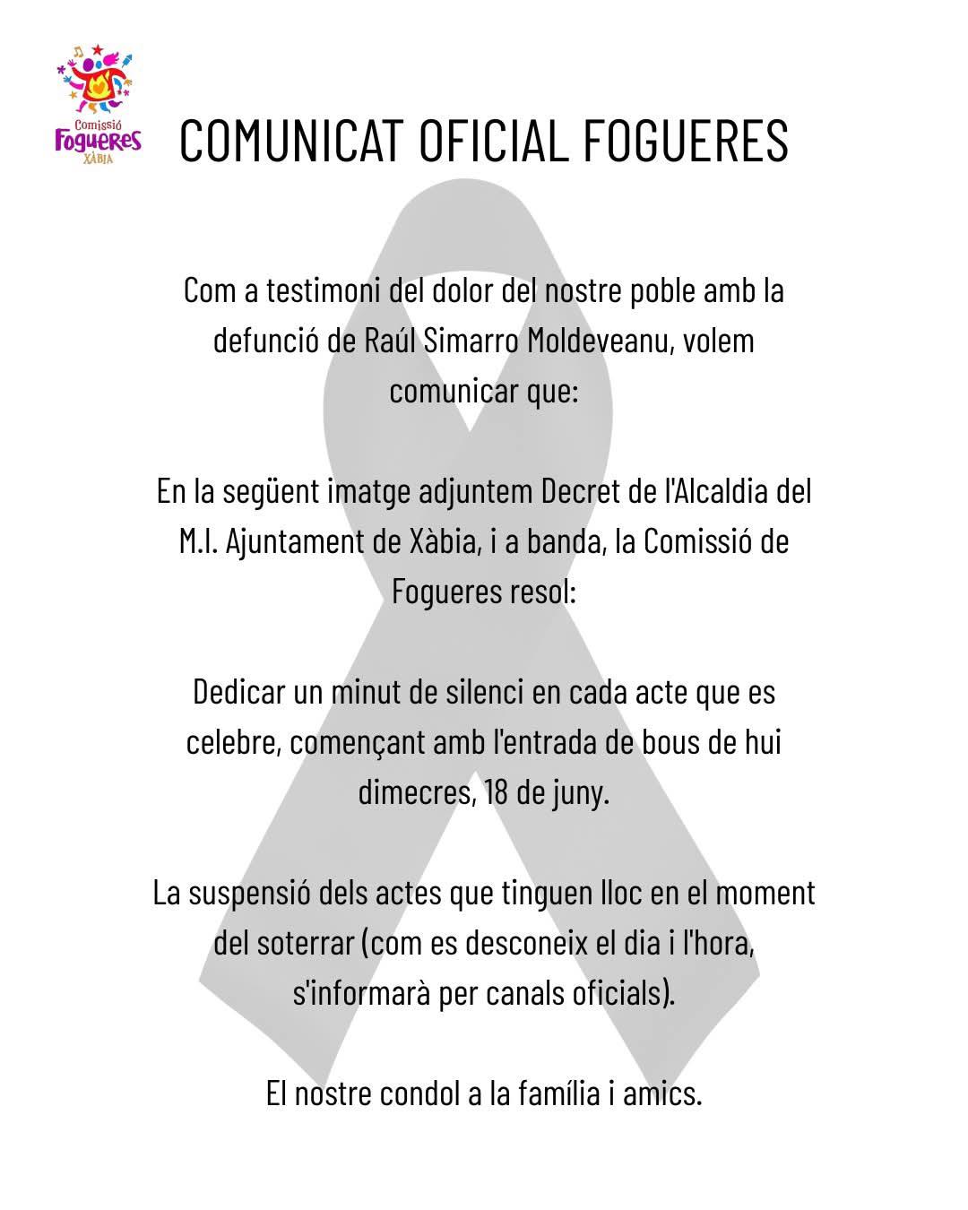 Por su parte, desde la Comissió de Fogueres muestran su «pésame a la familia y amigos» e informa una serie de adaptaciones en el programa de fiestas.